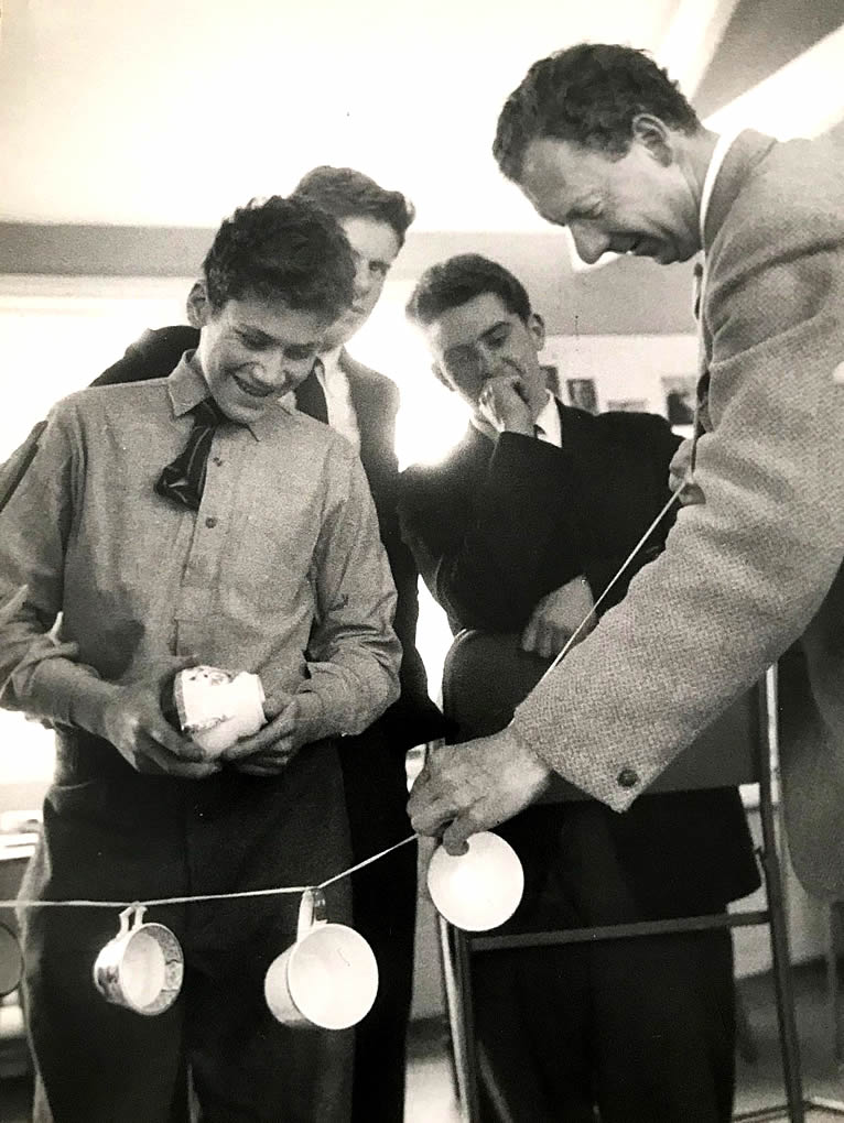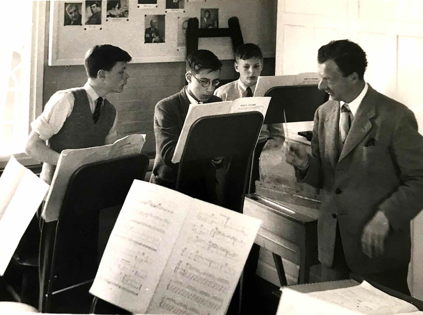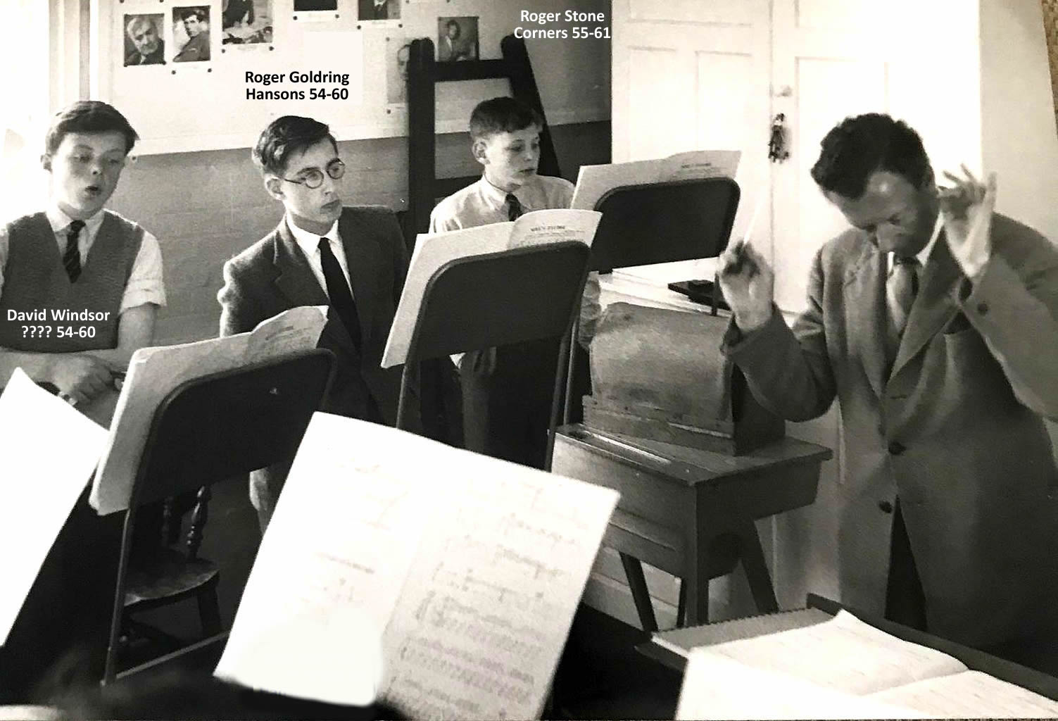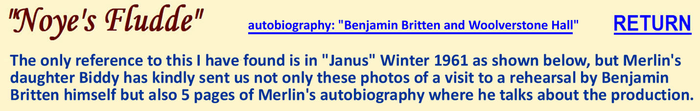 | "Janus" Winter 1961: "A party of boys went to Aldeburgh, keeping up a tradition set at its first performance in 1958, to rehearse and take part in Britten’s Miracle Play,“Noye’s Fludde”, part of the Aldeburgh Festival. Carter, Linklater, Lonergan, Prendergast, Howes, Bauer and Crawford played difficult percussion parts extremely well; Fletcher, Gentry and Aczel acted the parts of the “stage-hands”. The conductor, Norman Del Mar, came to the school for one rehearsal. A recording by Decca will be released in November." (Roger Goldring - Hansons 54-62) |