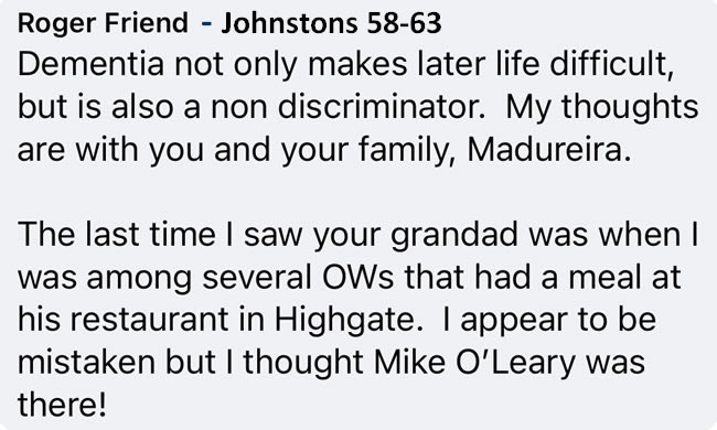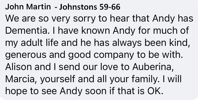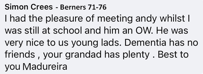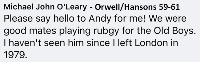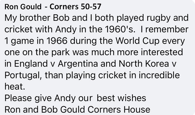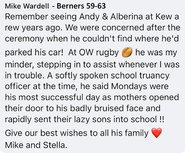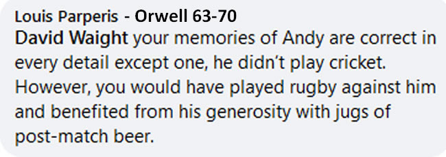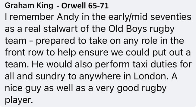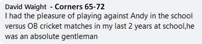 And after WHS Andy made a massive contribution to the Old Boys' Association and in particular the Old Woolverstonians. WHS Old Boys therefore owe him a great debt and pass on our thanks and very best wishes.