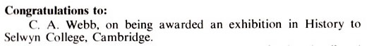 Do you remember a tree just to the right and slightly behind the pavilion when looking from the cricket square? It had a high branch over which Chris Webb, I and a couple of others used to go sometimes to try to lob an 8lb shot over the branch. Chris managed it with ease but I never got more than 60% of the way up. He was not big in the first year but by the 4th form or so he was over 6ft and very strong. He was also a tremendous rugger player and an extremely nice bloke who never used his strength in a bad way. He should have won the All-England shot-put championship with a 53ft putt, but that throw was disallowed ....