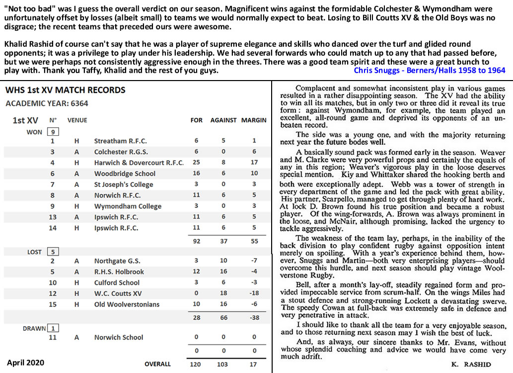 | Losing at Wymondham - Chris Snuggs ('58 to '64) I must have played in some 70 or more rugby matches against other schools at WHS, yet remember only bits and pieces here and there; mere snippets of events, shadowy scenelets which drift in and out of memory. As recounted elsewhere, I remember at the end of a 1stXV match we lost to Holbrook standing on the pitch at the end wondering what the hell had happened. Then I remember being 63-nil up against Woodbridge in the UXIVs thinking: "Well, this is a bit pointless." AND I remember this ...
