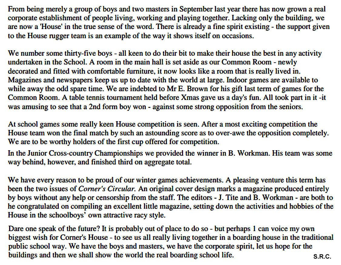 Our sleeping accommodation has been boosted by the building of an annexe which houses 15 boys, and the whole House has been redecorated in controversial colours. Changes have also been seen in our staff. Mr. Scratton looked after us for a term and everyone, both in Corners House and in the rest of the School, was sorry to see him leave . However, he frequently visits the School, and he will always be welcome. His successor, Mr. Munro-Cape, only remained with us for a term before going off to complete his training.