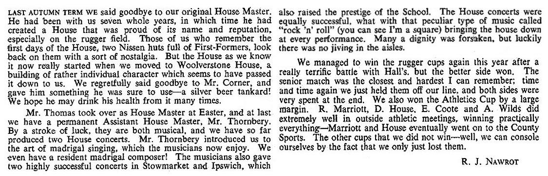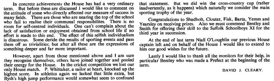 In the winter games, we lost in the final of the Rugger XV's, but vindicated ourselves by soundly winning the Seven-a-sides. Easter saw several of our boys in Ipswich attending a cricket coaching course. It must have been a good course, since we easily retained the House cricket trophy in the summer. Hardy paid a visit to a French family in the holiday, and Croucher endured the rigours of the Suffolk coast on a geological expedition.