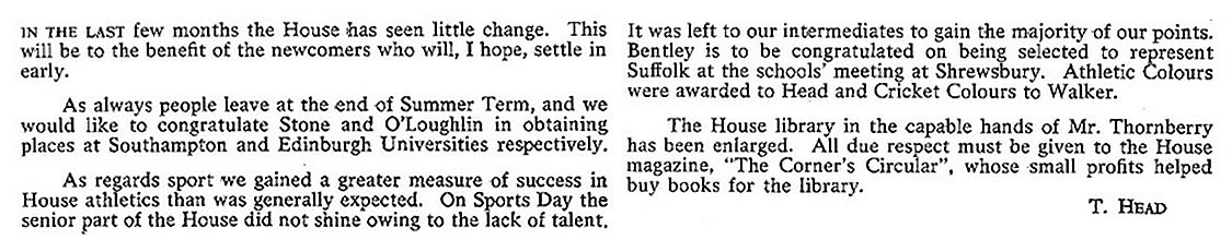 Mr. Shuttleworth has left the school, and we welcome Mr. B. Davies as our resident assistant master. We hope he will be happy with us. Brian Jenkins has left the house - he has emigrated to Australia - we shall miss him.