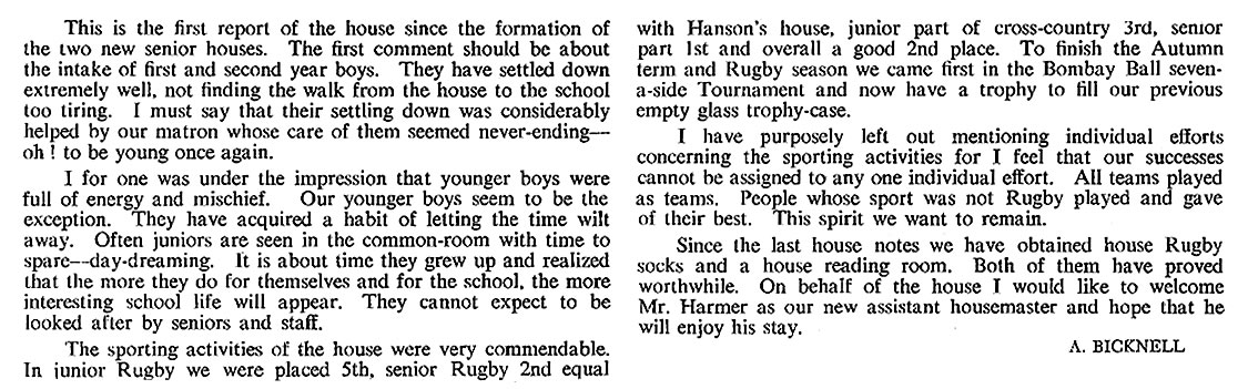 In the school games, the house has again won the rugger and sailing cups. The teams deserve our heartiest congratulations. I dare not mention how the cricket cup slipped from our grasp in the last match of the season. We congratulate Mr. Hanson's boys on winning it from us.