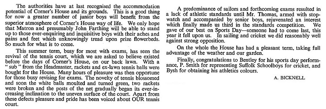 The summer was very busy for us all. We attacked the wilderness round the school pond-formerly called the Maze - and after many hours' toil have turned it into pleasant lawn. Every boy in the House deserves praise for this huge task so successfully accomplished. Many and interesting have been our pursuits. McCulloch, Davies, Workman and Croucher have spent several weekends at Belstead House, in earnest discussion, intellectual advancement - and even in social pleasures - with other young people. I hear that they can "shake a nifty leg".