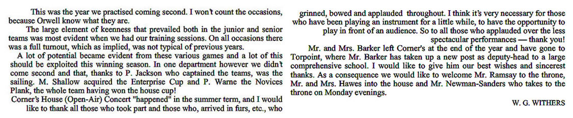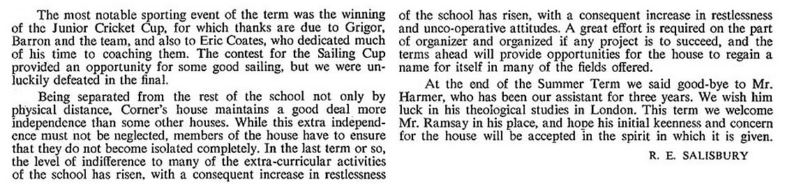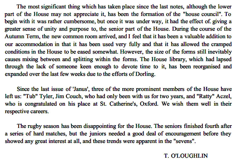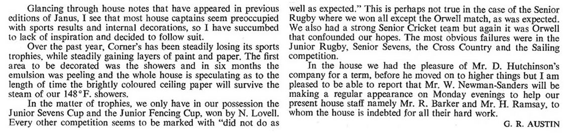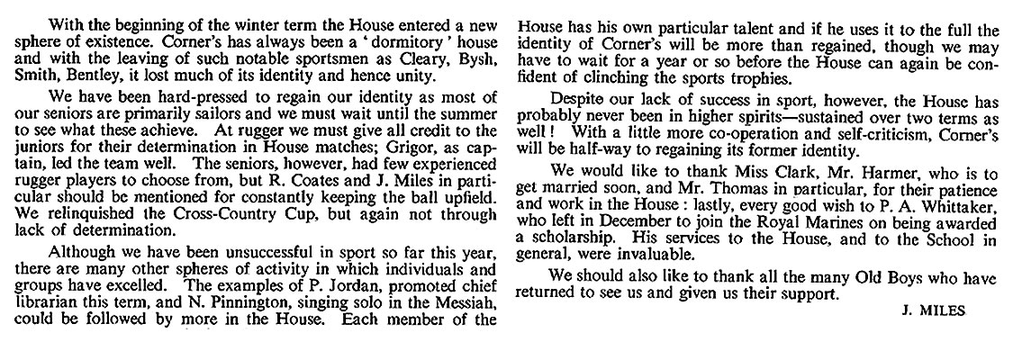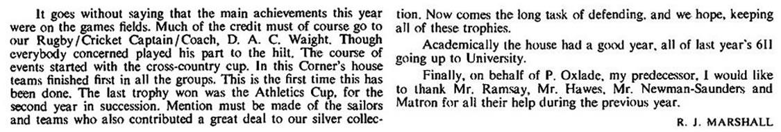 Some reminiscences. Others welcome - just contact me. I had hoped to add a definitive list of staff and captains, and have put in the names where I can. However, it is impossible to be sure about the staff, particularly the Assistant Housemasters - and the names of most Sports Captains remain to be added by someone. As for House Captains, I have assumed that the authors of the House Reports were the House Captains - but I could be wrong of course .... (Chris Snuggs - June 2018)