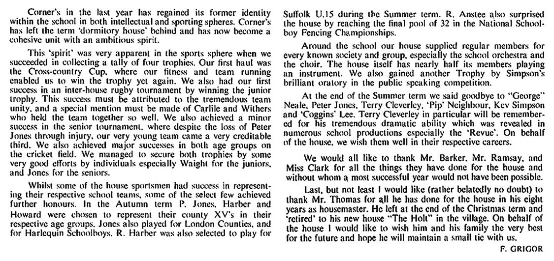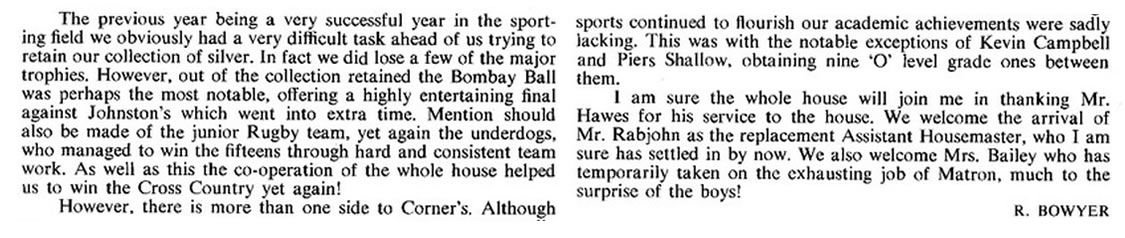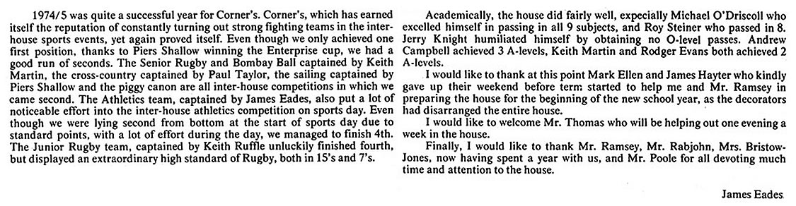 Jim Hayter: "Mike's account I think was pretty common for us 'Cornerites'. We had good friends in other houses so you could get tea, coffee and toast 1969-1976 rather than take the walk. Other times of course it was good to get away from the main school. James Eades was my year; he was head of house 75/76 school year." |