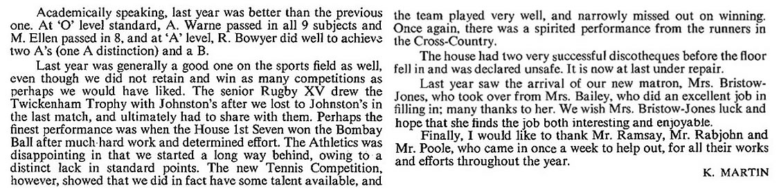 - In two minor inter-school activities the House provided prominent members; Pinney (Captain) and Stevens in the School badminton team and Aczel and Durrant in the chess team.