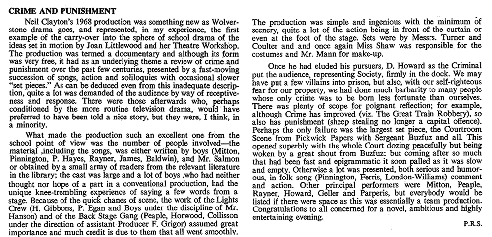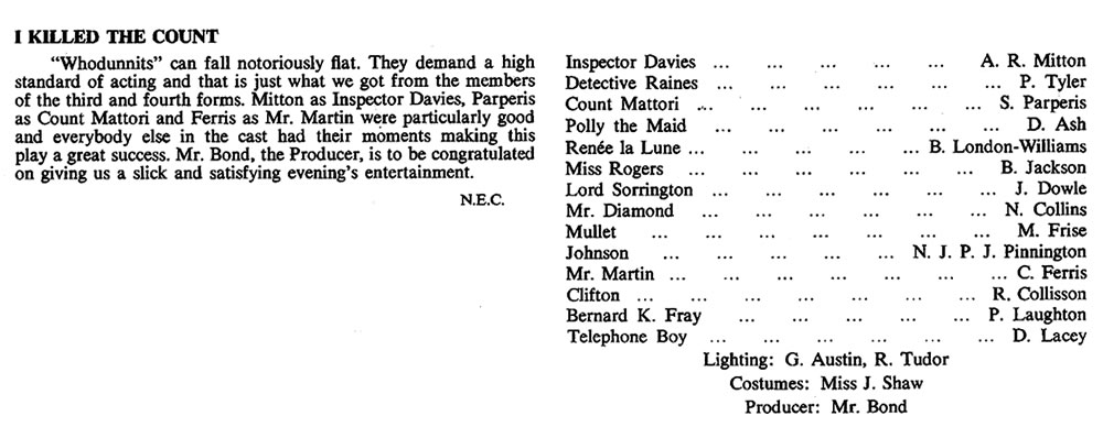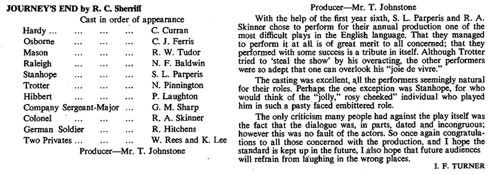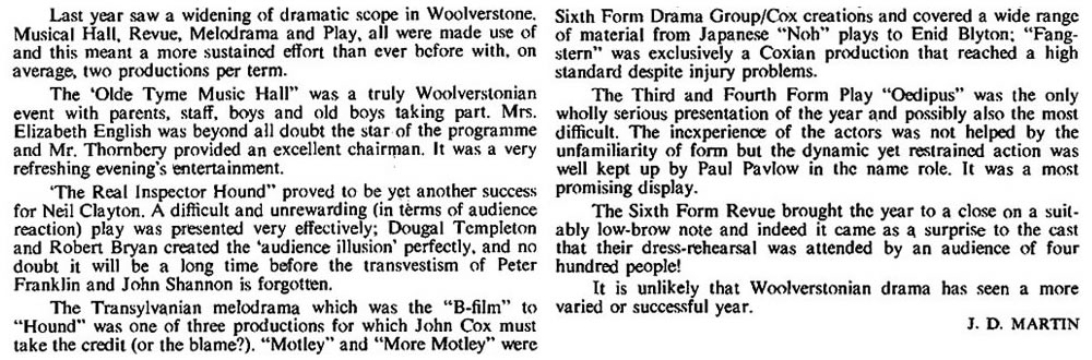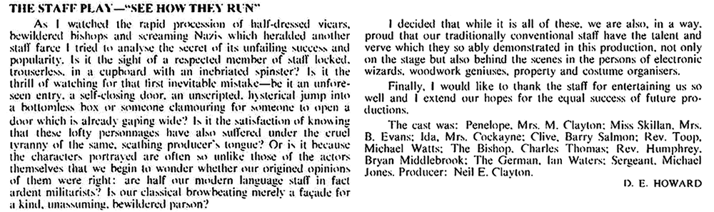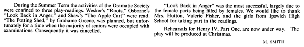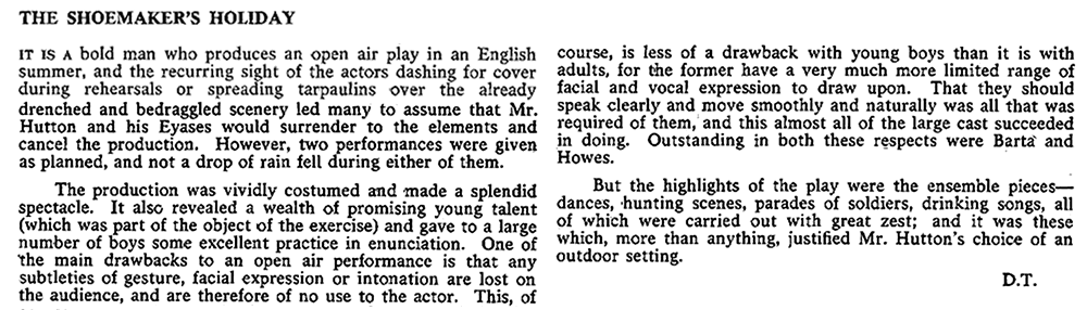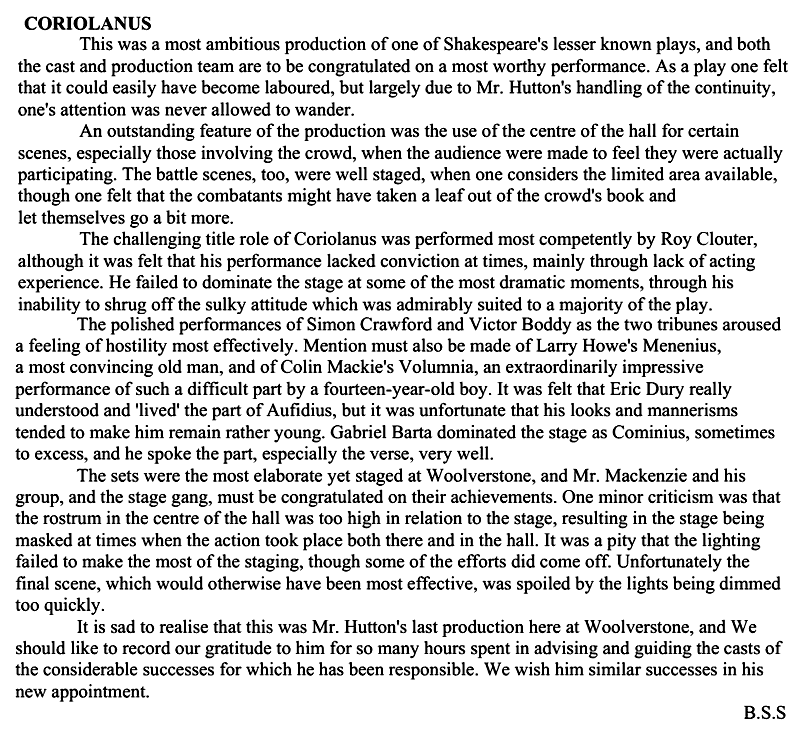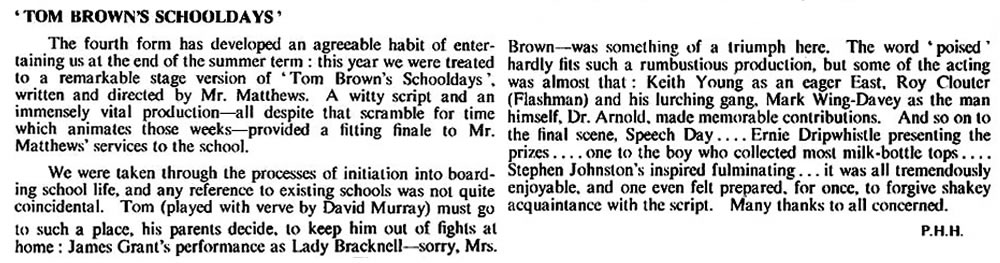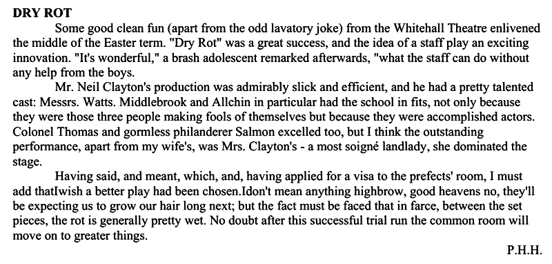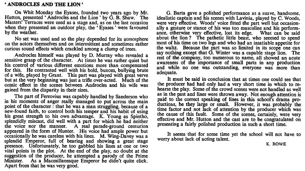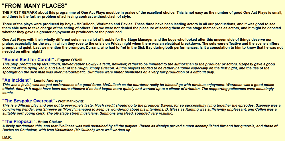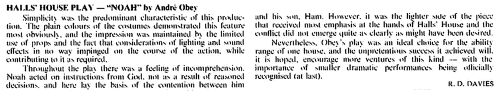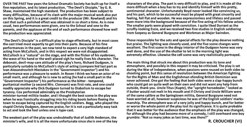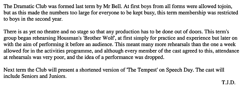 In trying to write a "criticism" of a performance by the School Dramatic Society, as I suppose in the case of a criticism of any dramatic production, one has to decide by what standards to judge the performance. Cutting out the highest standards one is left with (a) the previous performances of the Dramatic Society; (b) the performances one may have seen of other Schools; (c) the performances of non-School Amateur Dramatic Societies.