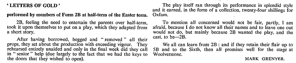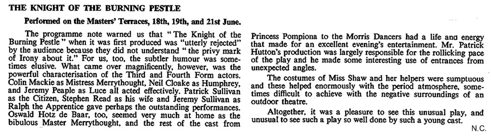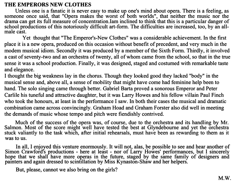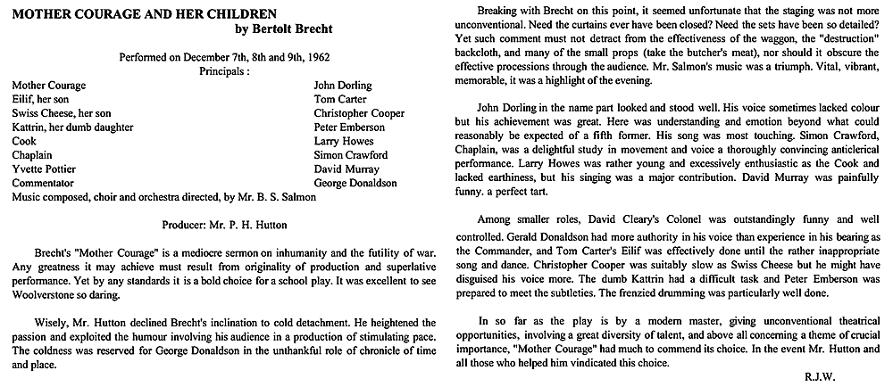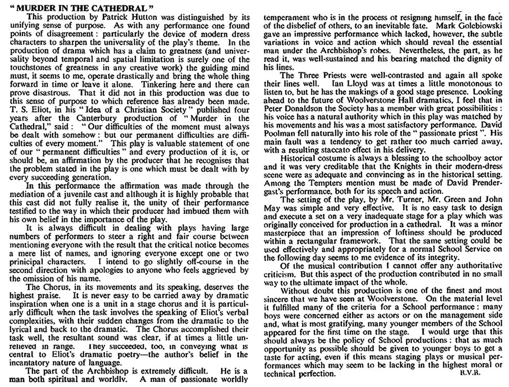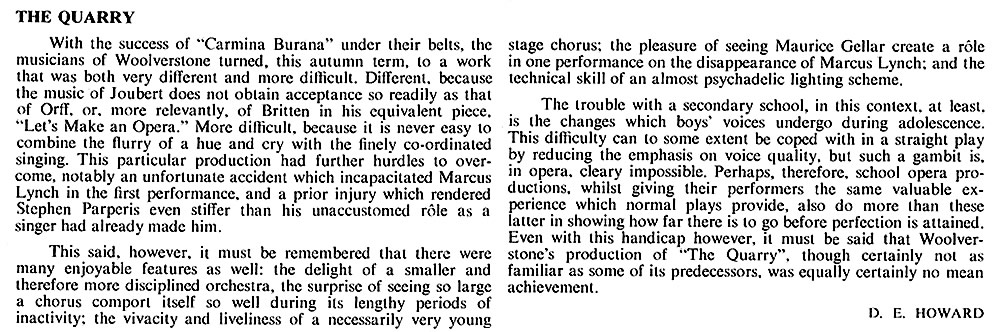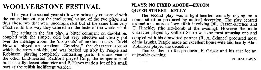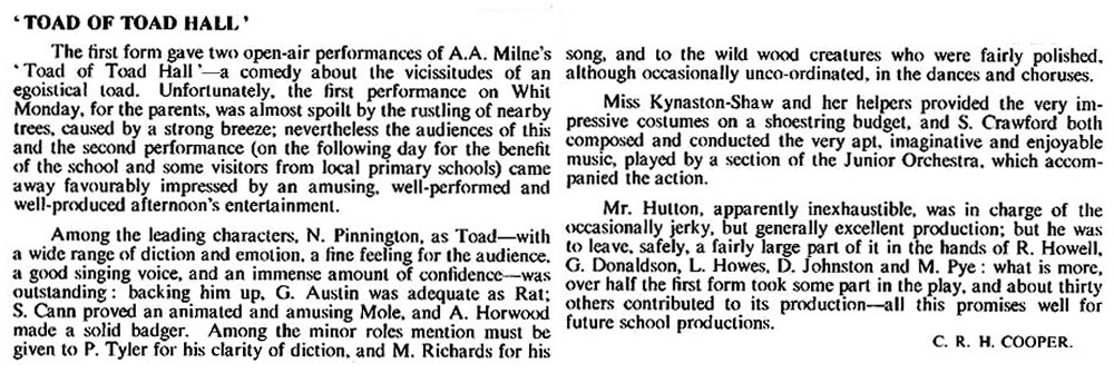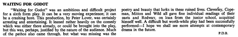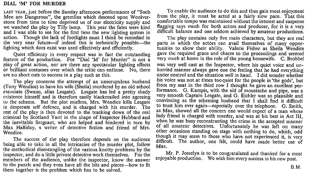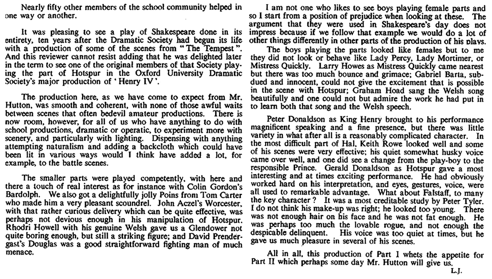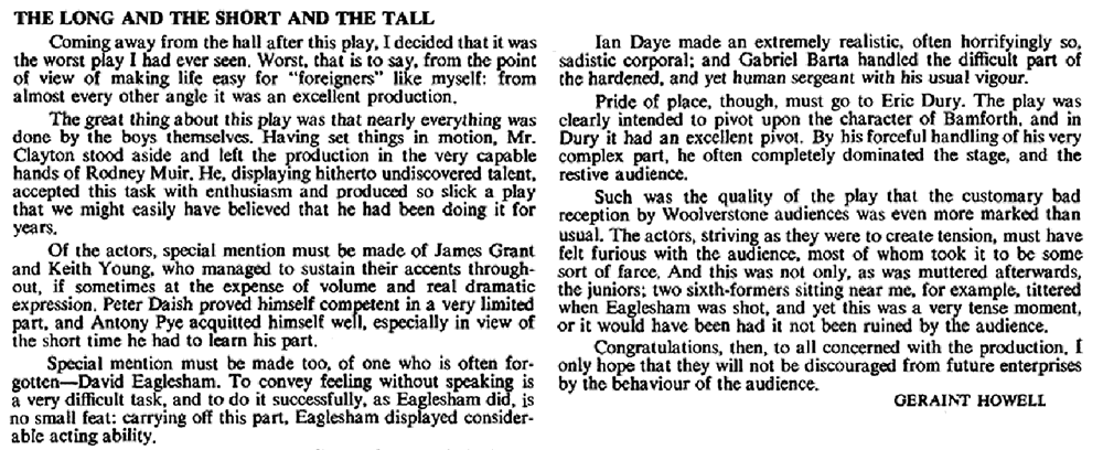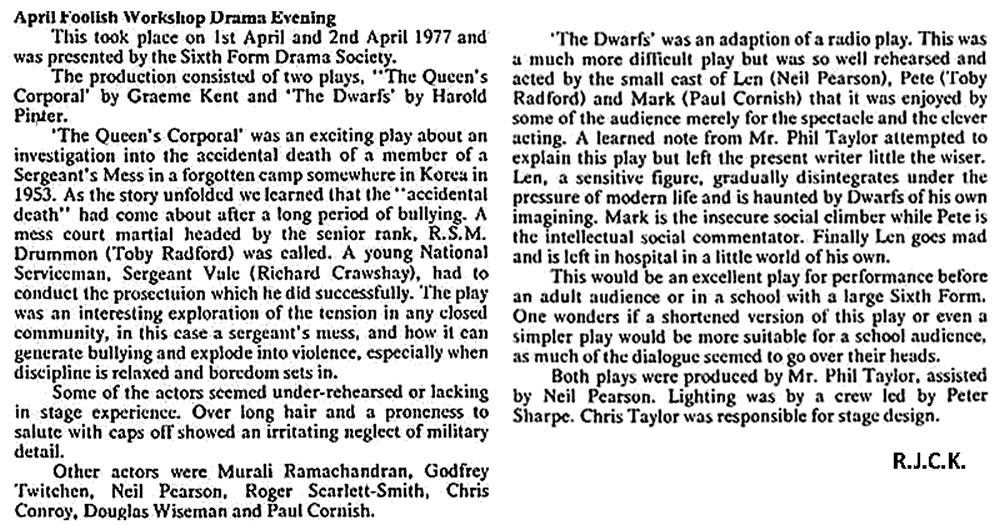 In trying to write a "criticism" of a performance by the School Dramatic Society, as I suppose in the case of a criticism of any dramatic production, one has to decide by what standards to judge the performance. Cutting out the highest standards one is left with (a) the previous performances of the Dramatic Society; (b) the performances one may have seen of other Schools; (c) the performances of non-School Amateur Dramatic Societies.