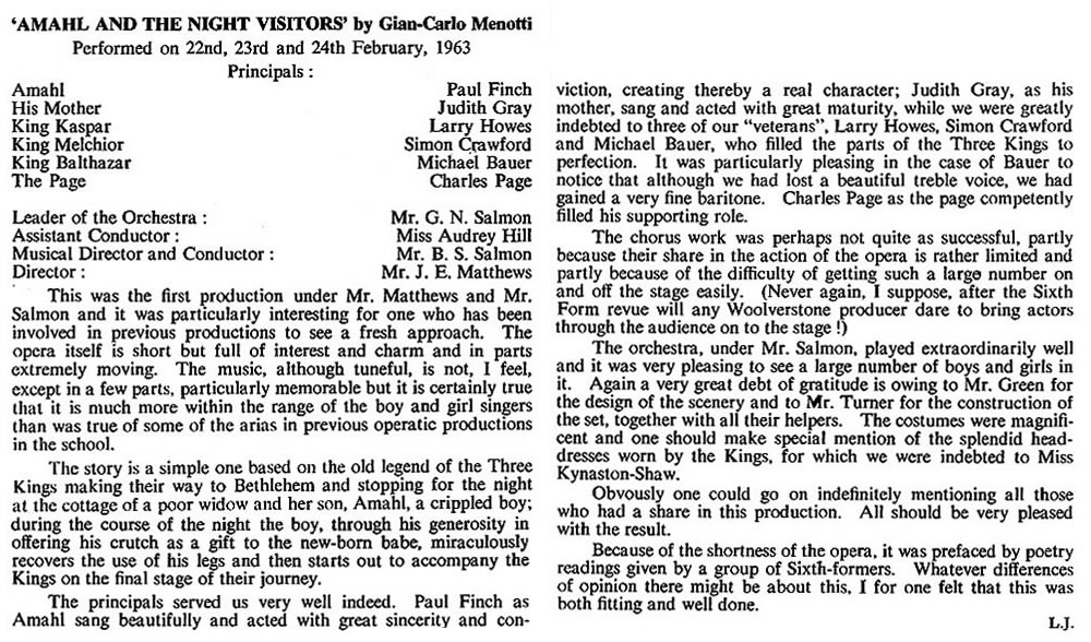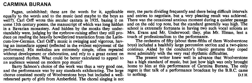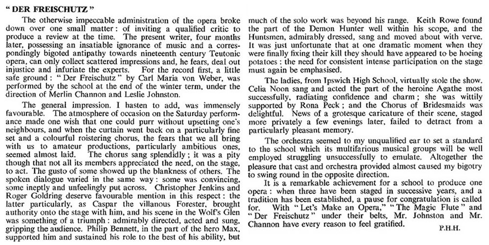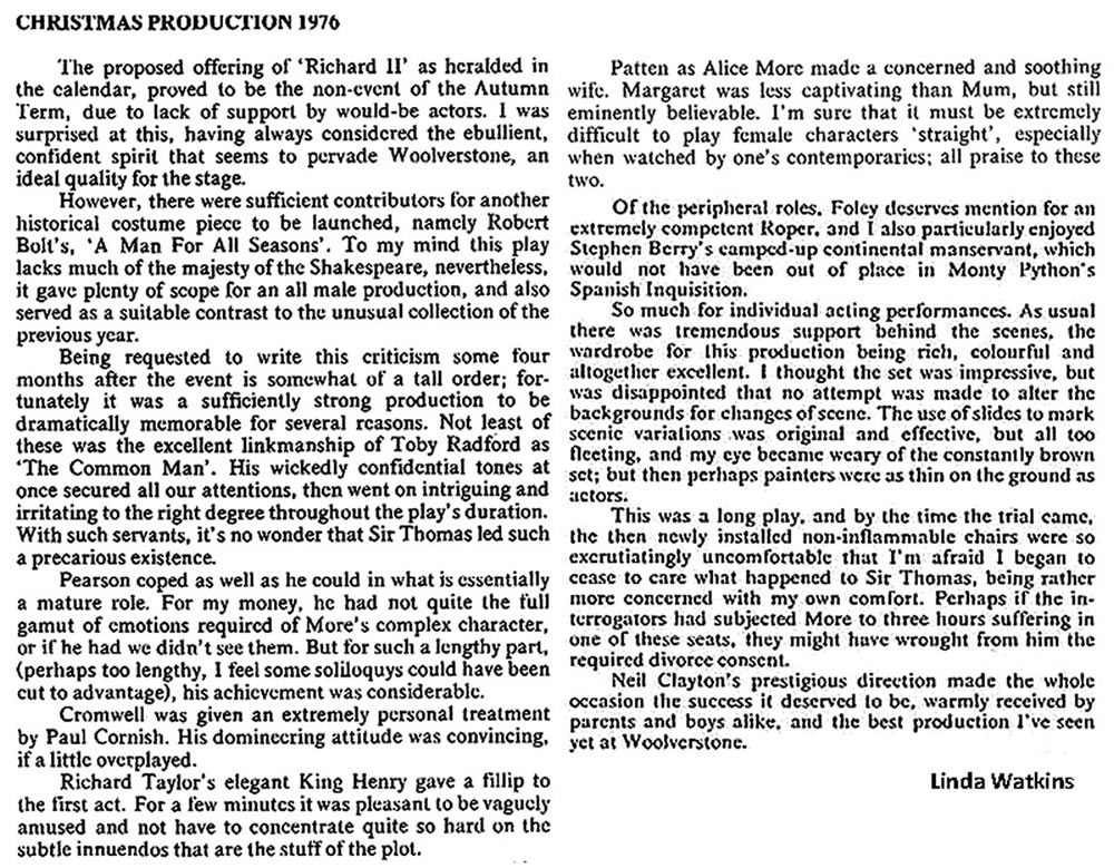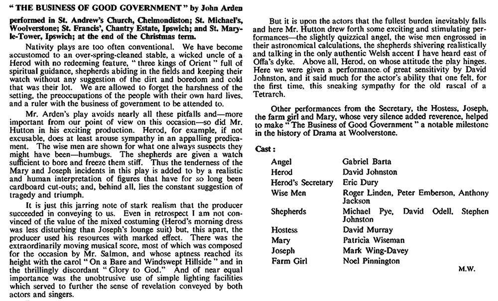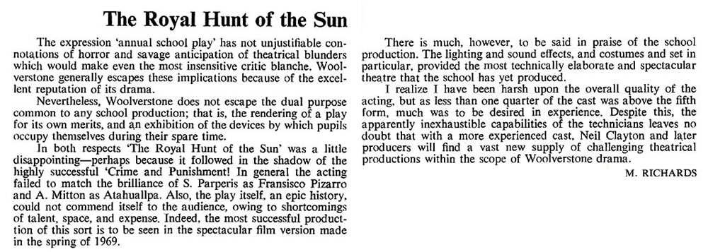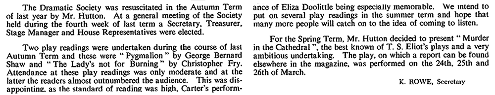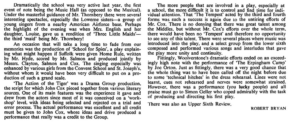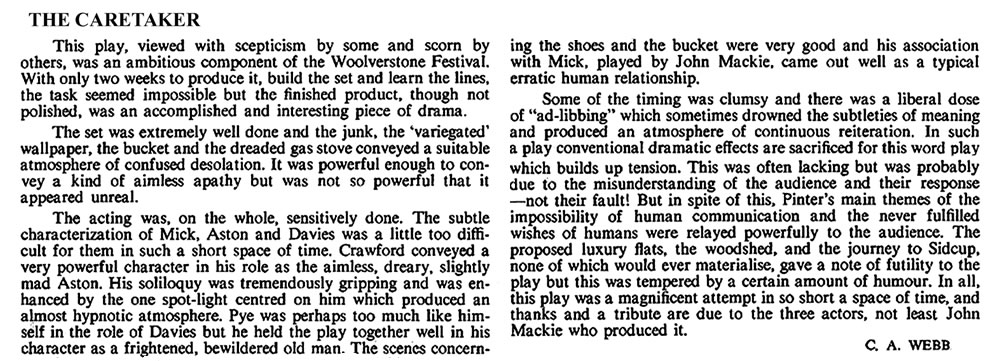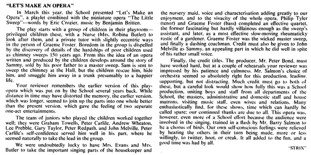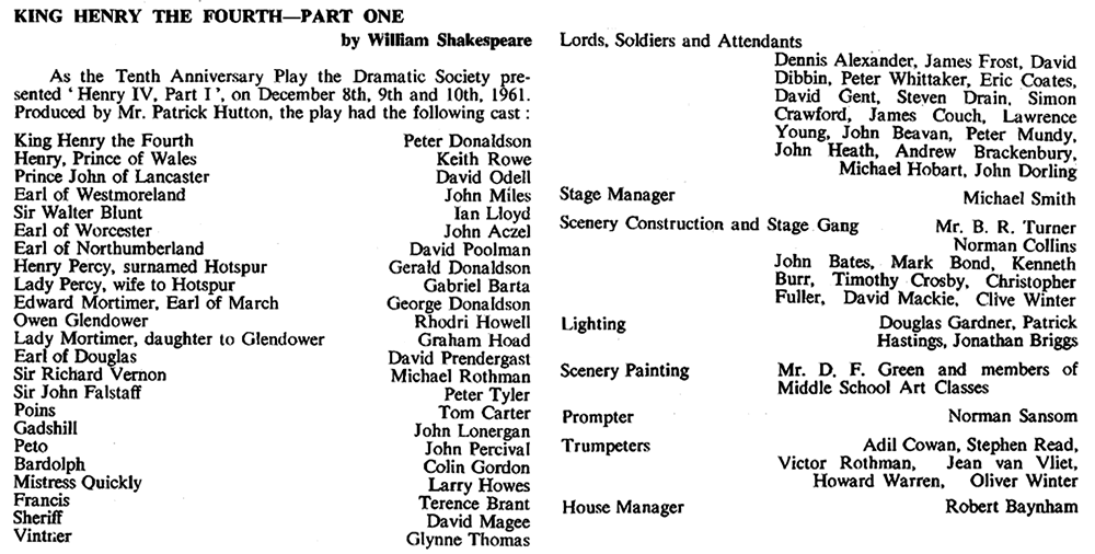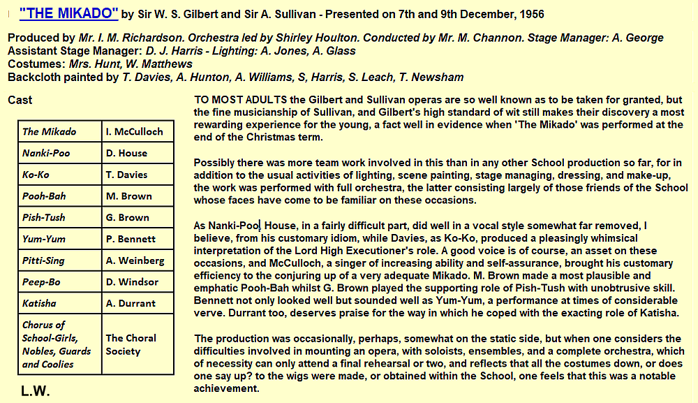 In trying to write a "criticism" of a performance by the School Dramatic Society, as I suppose in the case of a criticism of any dramatic production, one has to decide by what standards to judge the performance. Cutting out the highest standards one is left with (a) the previous performances of the Dramatic Society; (b) the performances one may have seen of other Schools; (c) the performances of non-School Amateur Dramatic Societies.