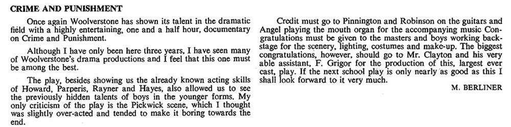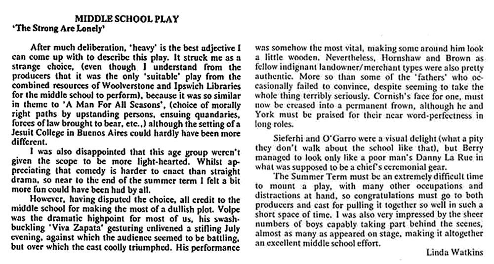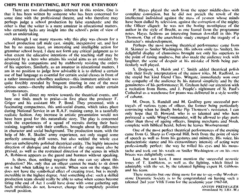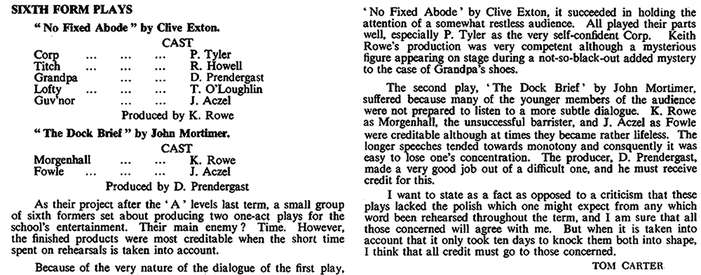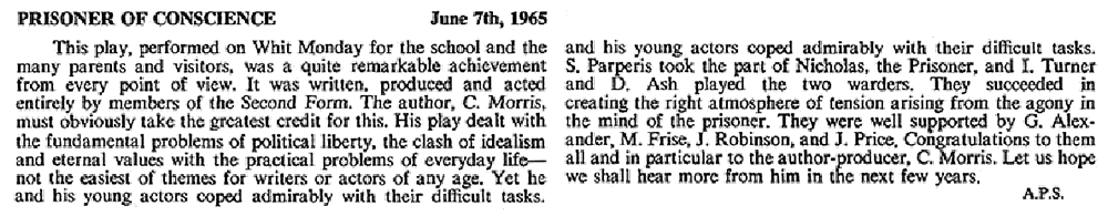 The main weaknesses, I thought, lay in the play itself. Out of Russia and out of its time, the idea is not strong enough for a full-length play. One or two scenes dragged, not because of the acting so much as because of the writing; for instance, the procession of officials handing over their bribes to the impostor became tiring. With regard to the acting the only serious fault was in at least two characters who added "business" obviously not intended by the director. Perhaps one of the hardest things for some schoolboy actors to learn is that on the night of the performance they do not replace the director's instructions with some individual acting (or clowning) of their own-particularly when such behaviour is liable to distract the audience's attention.