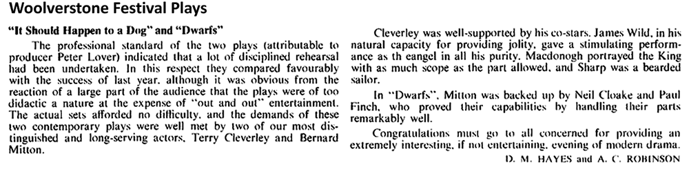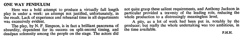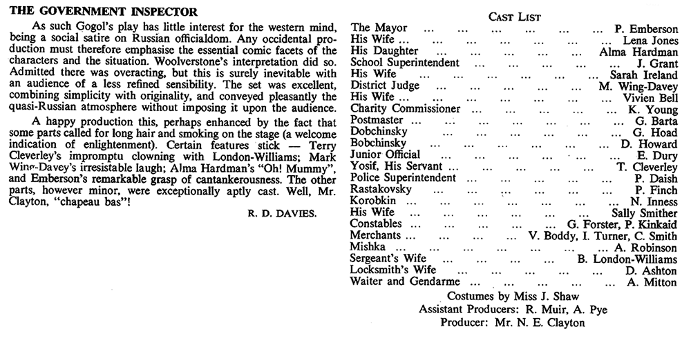 One of the tests I tried to apply in thinking about the performance was to ask myself whether I felt that I was watching, say, Workman dressed up, or watching the mayor of a small Russian town. The answer, of course, varied from character to character. I was, on the whole, impressed by Workman as the mayor, in spite of his continued tendency to take his lines at too high a speed. I found myself watching a fussy, pompous, bullying little man who perhaps was not quite as outraged as he might have been by the suggestion of his wife's infidelity. Considering the rather forbidding appearance of his wife this was possibly not surprising. Swannell looked like a woman without feminine charm; I couldn't imagine even the pseudo-inspector being interested in her. Swannell did not quite live up to the promise he had shown in his House play at the end of the Christmas term, but I should still like to see him as one of the old ladies of Arsenic and Old Lace with Gilbert as a partner - a Gilbert that is, without his imposing stomach, which in this production he manipulated so successfully. Boyd, as the daughter, looked the part but it is a thankless part and Gogol rather than Boyd was to blame for its shallowness. The assembled rogues of the town - Cox, Glass, Davies, Begg, Bass and Bauer-were a good team. I liked Cox's appearance and presence, although his speech was sometimes too confidential; Glass got inside his part remarkably well; Davies' postmaster amused me very much and I thought the episode of the opened letter a little gem. Begg looked uncomfortable, and Bass and Bauer made me think (inaptly I admit) of Tweedledurn and Tweedledee. When Lamb refrained from over-playing he was very effective and created something of the atmosphere of a Dickensian character. The smaller parts were adequately filled, although I think Rosen worth singling out for a very effective little piece of acting. |