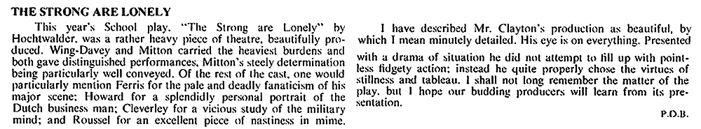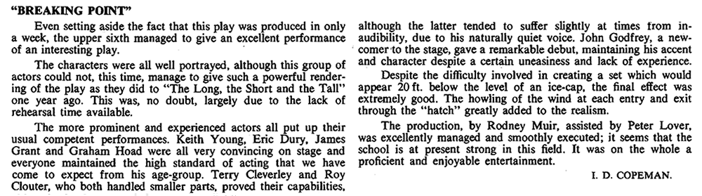 But after recognising the high standard of teamwork in the play there is still the main character, on whom so much depends, to be considered. And here McCulloch served us very well. On the only occasion when I saw the play in rehearsal I watched the "drunk scene" and found myself watching not McCulloch but a drunken impostor. This impression of a boy really taking on a character on the stage continued during the actual performance. The gestures were appropriate and sure, the timing remarkable, the use of voice and eyes so effective. It was a very fine performance.