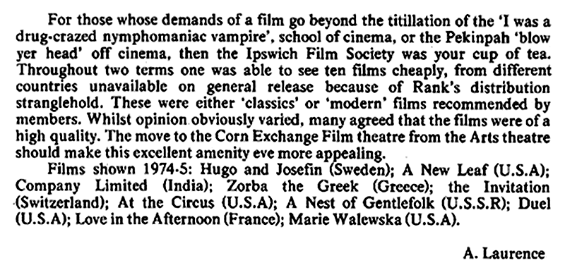 The third and last film of the term was held on Saturday, 22nd March. It was called "Kind Hearts and Coronets", and was a comedy-drama. It was about the life of a young duke who gets revenge by "exterminating" all those who abused his title. He ruthlessly murders all who stand in his way, but is at last brought to justice rather ironically. Although it seems very unlike a comedy it is surprisingly quite funny in some places.