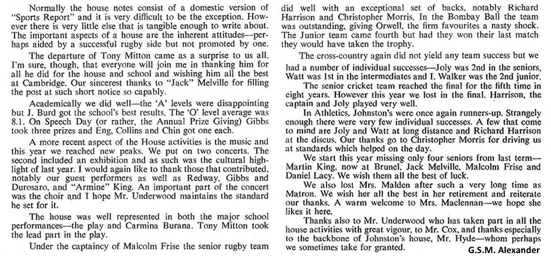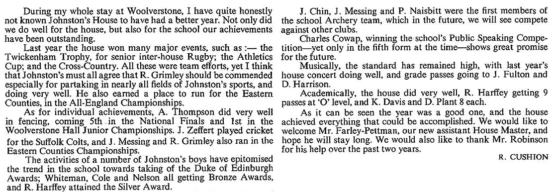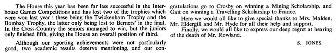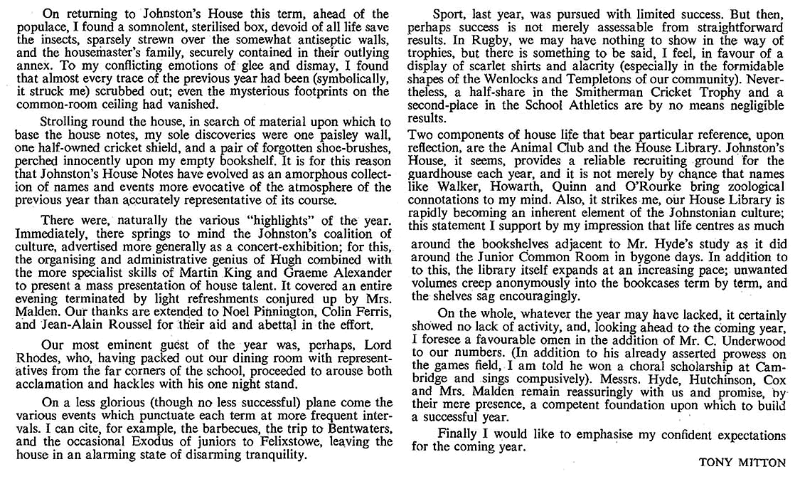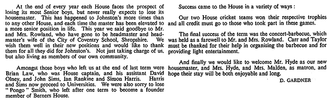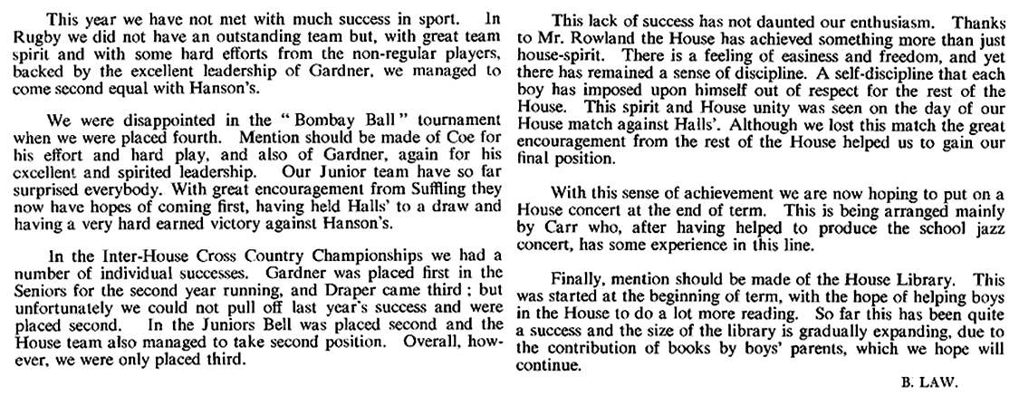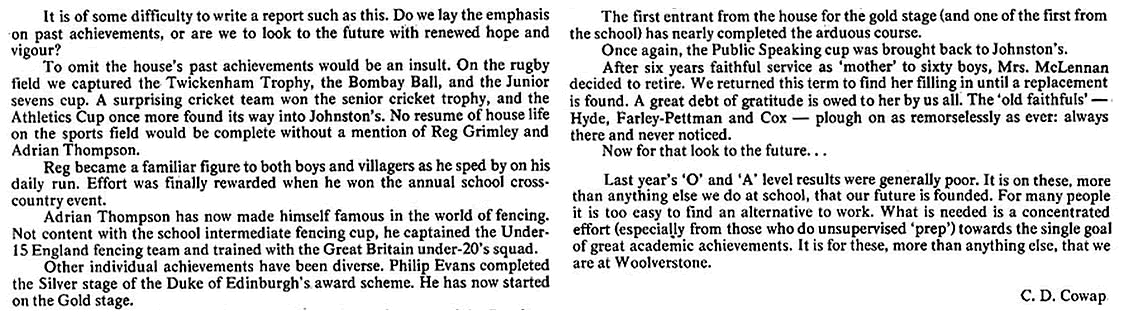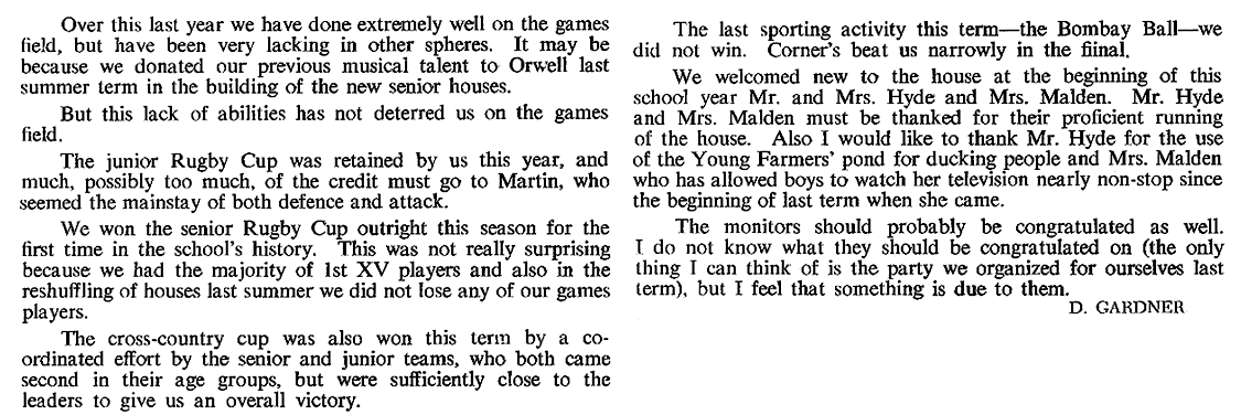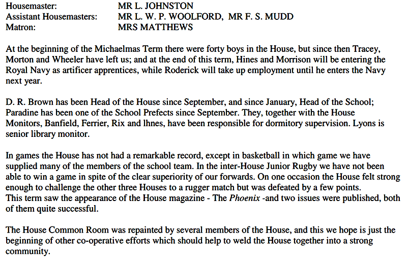 As usual it was a mixed year. We did not win anything - not even the cross-country race (although in Gordon-Smith and Munday we have two of the best cross-country runners in the school). But I was proud of the way in which the 1st rugby XV fought in their interhouse games. That spirit, and the talent in the present 3rd form augurs well for the future. And it is good to see four of our house playing so stalwartly in the school 1st XV. I was proud too of the performance on Sports Day even though we were not able to match Hanson's total of points. In cricket - in a poor season all round - we were not particularly inferior to any other house. But, in any case, games are not the be-all and end-all of existence. Looking back on the year I remember the busy activity of many boys in the common room, particularly at weekends; I also remember the aimless waste of time by the few who still don't know how to spend their leisure. I think of the boys coming in and out of my study to borrow books or look at stamps and catalogues; I remember a jolly good house party at Christmas, and an amusing contribution to the school Christmas party.