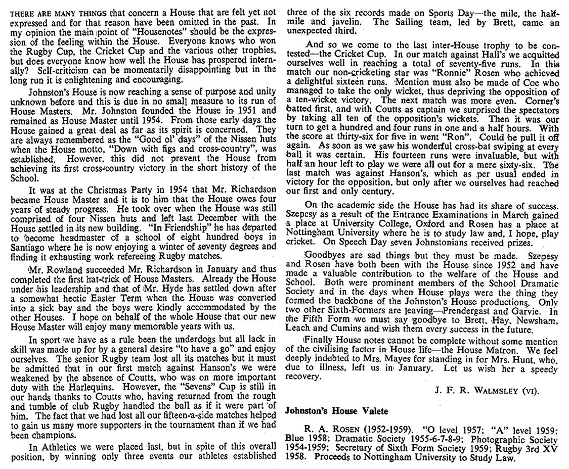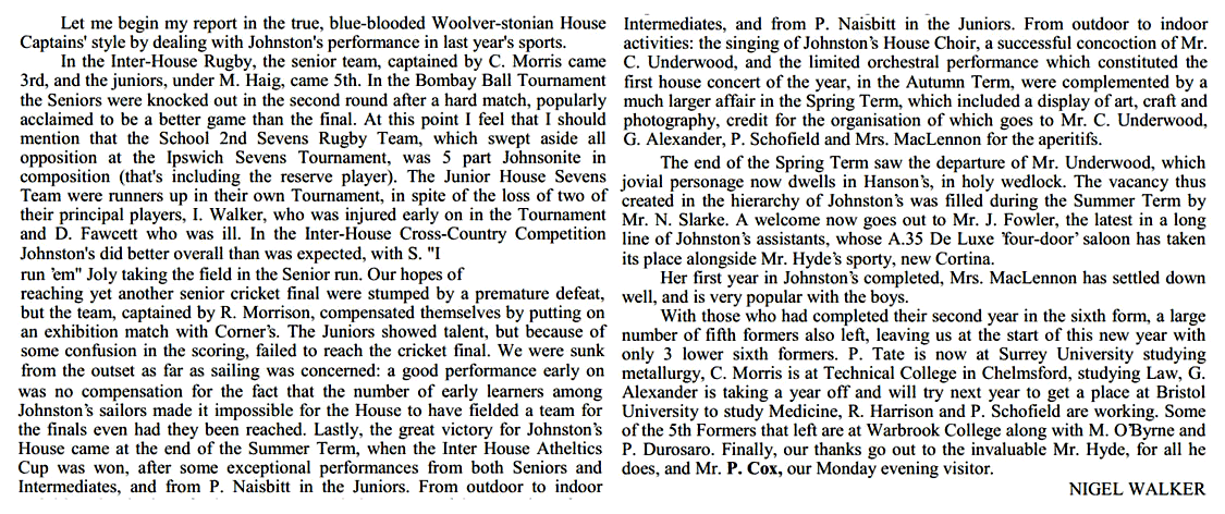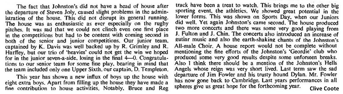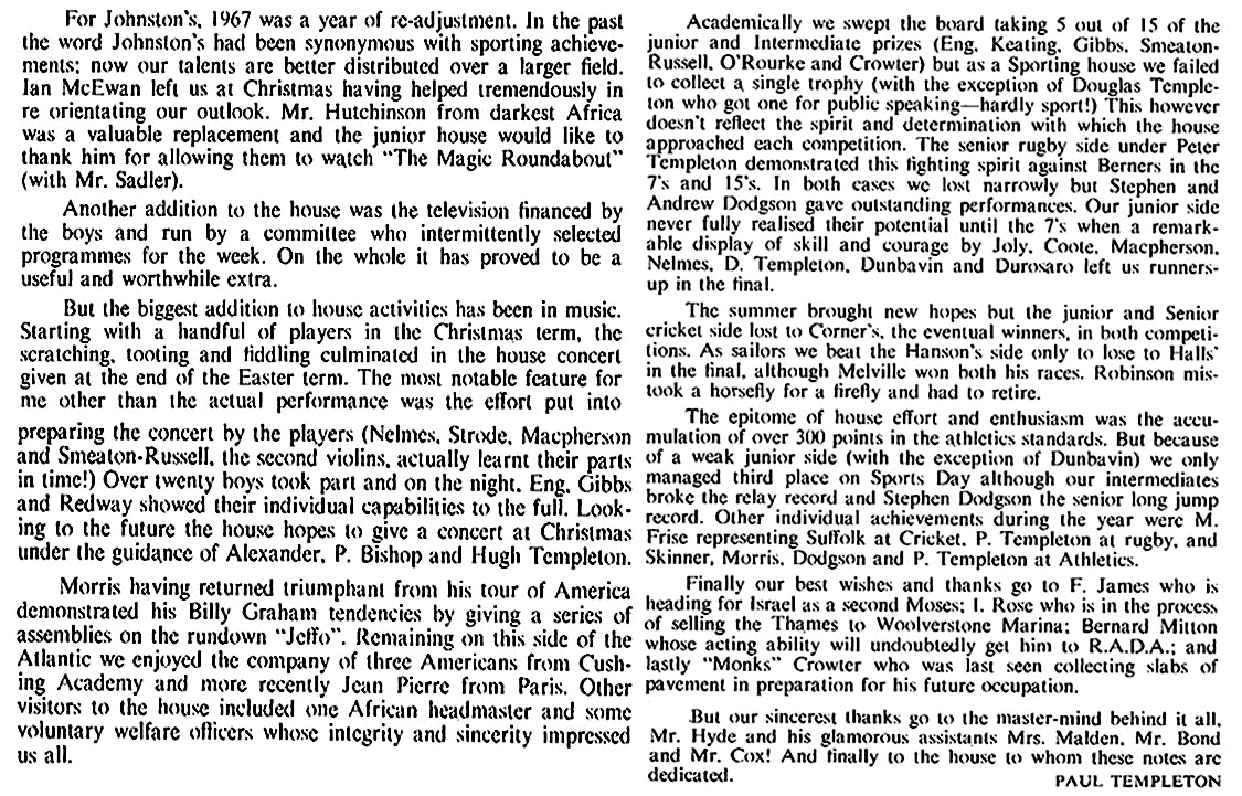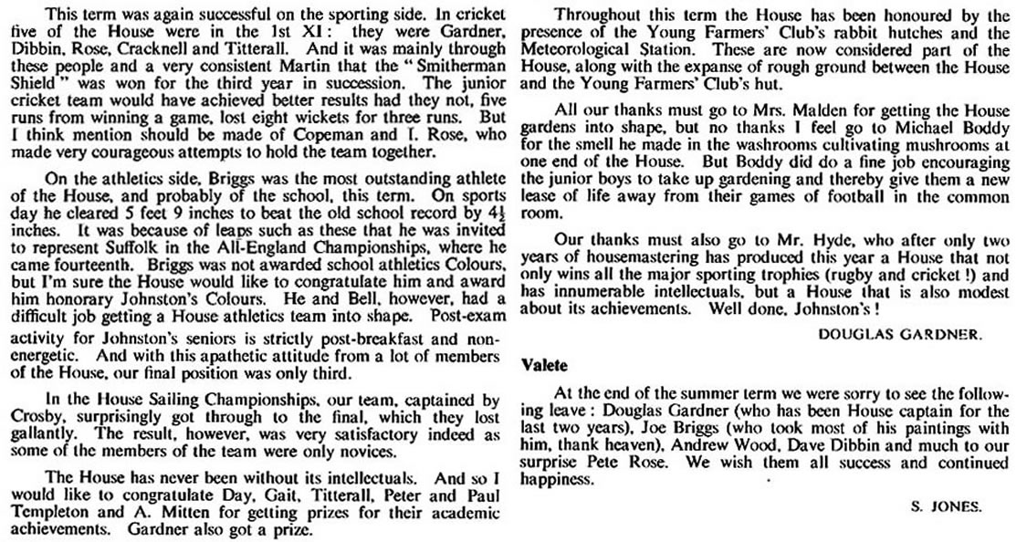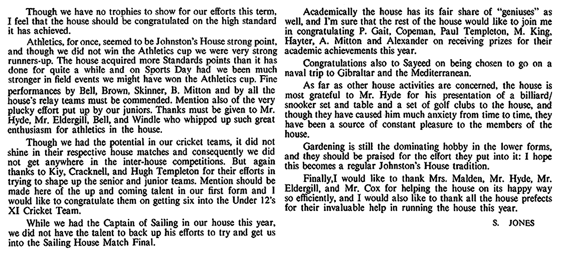 Looking back over the year, the House has made average progress. I think our most commendable effort was in the Inter-House Rugby, especially in the seven-a-sides, where we came second to Halls. Cricket and athletics, however, seemed to lack the usual House spirit, and this brought about the downfall of our teams. But perhaps the teams were still recuperating from the rugby season. In the cross-country we again carried on the old House tradition of coming last and once again having a Johnstonite placed first - and for this effort Walmsley is to be heartily congratulated. In the Sea Cadet swimming we were the only House to produce a swimmer for an individual event (100 yards free style) in the All-England meeting in Jersey, at which the swimmer - Andrew Hunton, did extremely well.