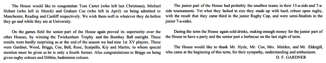 Congratulations also to Henry Clark on becoming a Blue, and I hope he, A. Glass and Walmsley as Senior House Monitors, and Szepesy, Buckland, Coutts, Tweddle and Rosen as Junior House Monitors will keep the House running as smoothly as it has been so far this term.