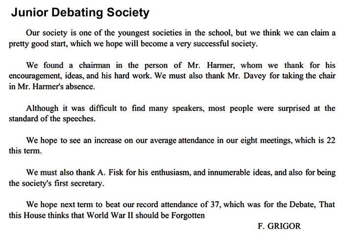 THE SOCIETY held its inaugural meeting on Saturday, 8th February. Forty six boys were present and Sexton was elected as Chairman for the term with Gardner as Secretary and Dracass as Treasurer. There is a committee of six to represent each House.
