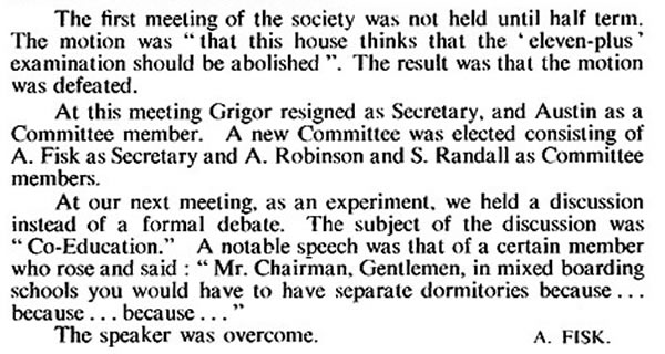 The subject of the first debate, "A boy without a sister is to be pitied", was proposed by Mott and opposed by Russell. The motion was carried by 20 to 18 after a lively debate from the floor, with eight abstentions.