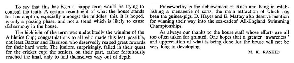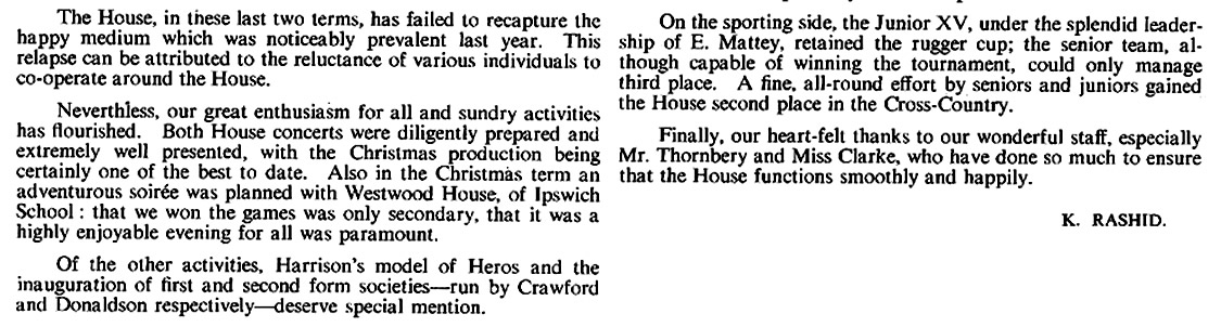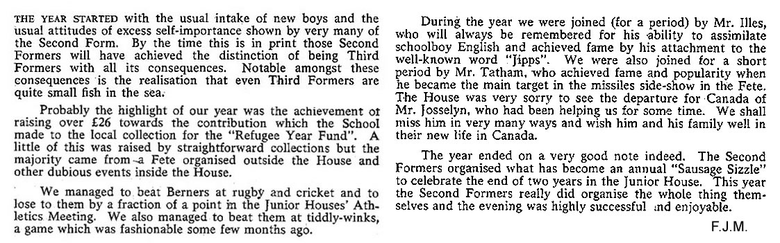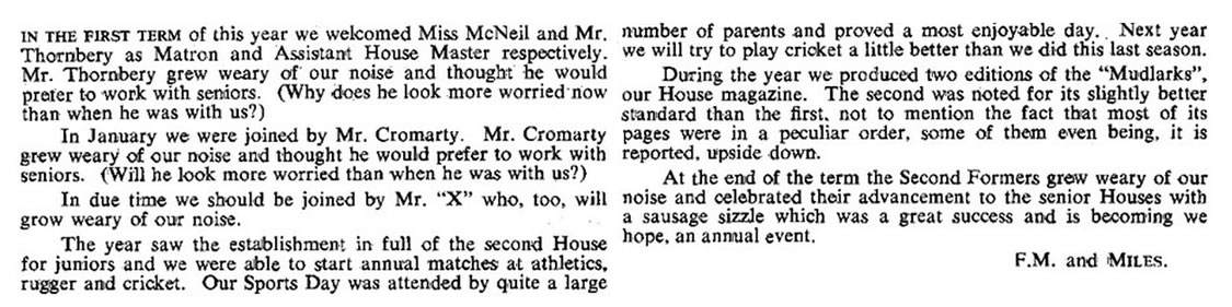 On the whole they had quite a good time, and I think that most of them have appreciated the fact that had they come a few years earlier the welcome would have been far different. Some of the boys were more adventurous than the others (as in the case of four of our members who left us for a short time early in their career). There are some people whom I could pick out from the rest as having done something just slightly more special than the rest, but it would not do to pick out any individuals. In rugger we managed to get quite a few of our members into the "Under 'Thirteens' XV," which I think is rather good, and there were many keen players in cricket establishing quite a good team. In the academic side of school life we had many strong points, and quite a few people have very good reasons to be proud of themselves.