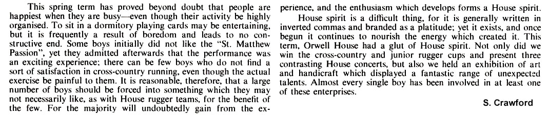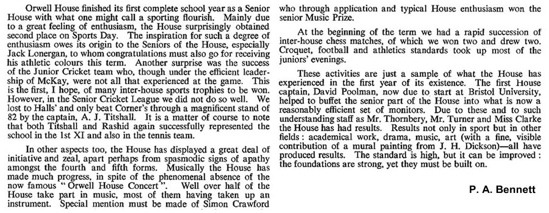 SINCE THE last account of this House was written many things have changed. While all the other Houses were in their new buildings we, however, remained in our Nissen huts which still bring back pleasant memories. In the second term the Junior House was reconstructed. We moved into our long awaited new House taking half the First and Second Forms, the remainder of the First Forms starting a second Junior House becoming known as "Berners". After a proposal that our House should be known as "Mudlarks" had been rejected we took upon ourselves the name of "Orwell". When we moved in, the seniors were Markham and Dye of Hanson's and Wilds and Pinney of Corner's. In the Summer Term, Markham left our House and Golebiowski took his place. Afterwards Pinney soon followed him, and Bicknell became a Senior. Mr. Mudd's model aeroplane craze soon converted our peaceful abode into a screaming aerodrome. Several of the members of the House have represented their separate Houses in both Rugby and cricket, while a few have produced one or two shows.  On Open Day, our hydrogen balloon idea brought in a large amount of money, which helps towards a swimming pool. We were very sorry to see Mr. Cowdrey and Miss Lockyer go, and we wish them all the best. On the whole it has been a fruitful year .