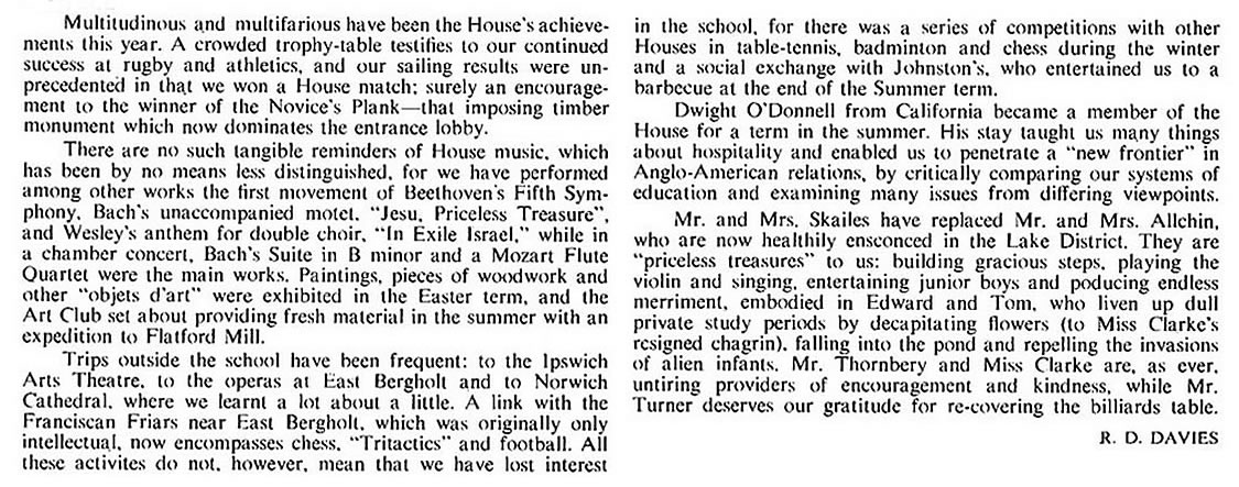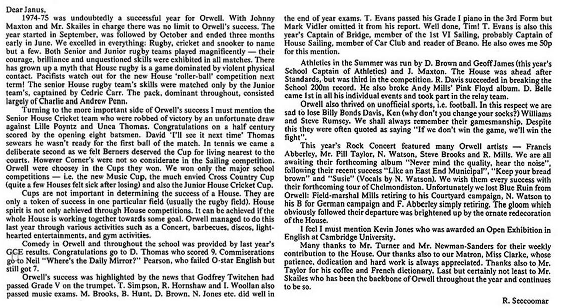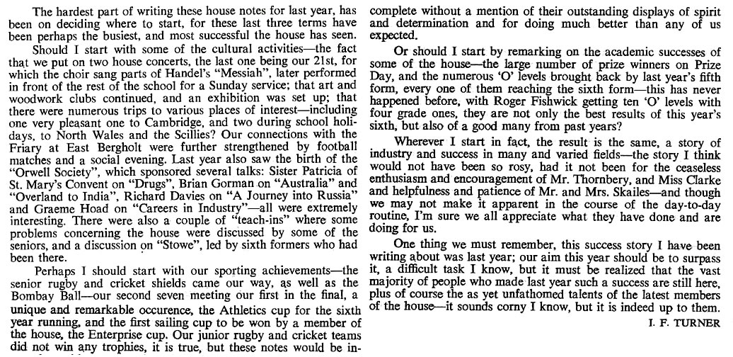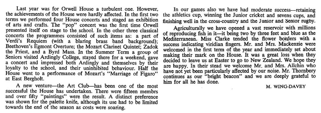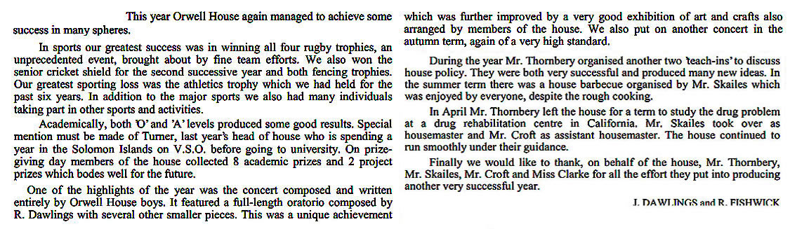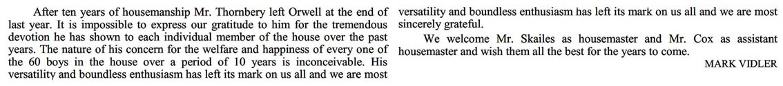 familiar with two Housemasters of Orwell: Fred Mudd and Derek Thornbery. I believe Fred left a fine legacy for Derek T. to take over