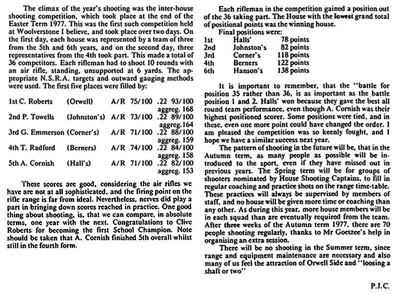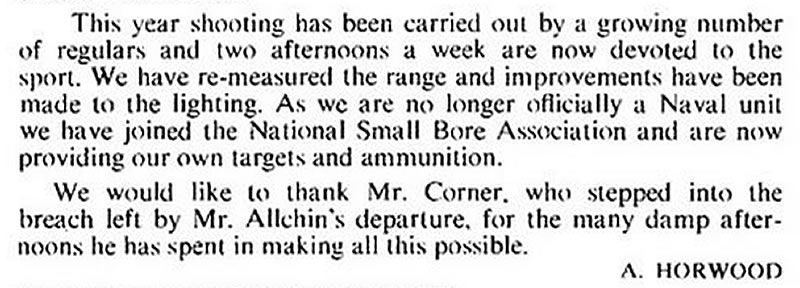 - A./L.S. Moss, O.S. Hardy, A./L.S. Hunton, O.S. Harrington and A./L.S. Glass (D.)-have reached the standard of 85 out of 100 required for the "Good Shooting Badge." When we have built the .22 range at school, as is under discussion at the present time, this number will be greatly increased, as will our shooting activities in general.