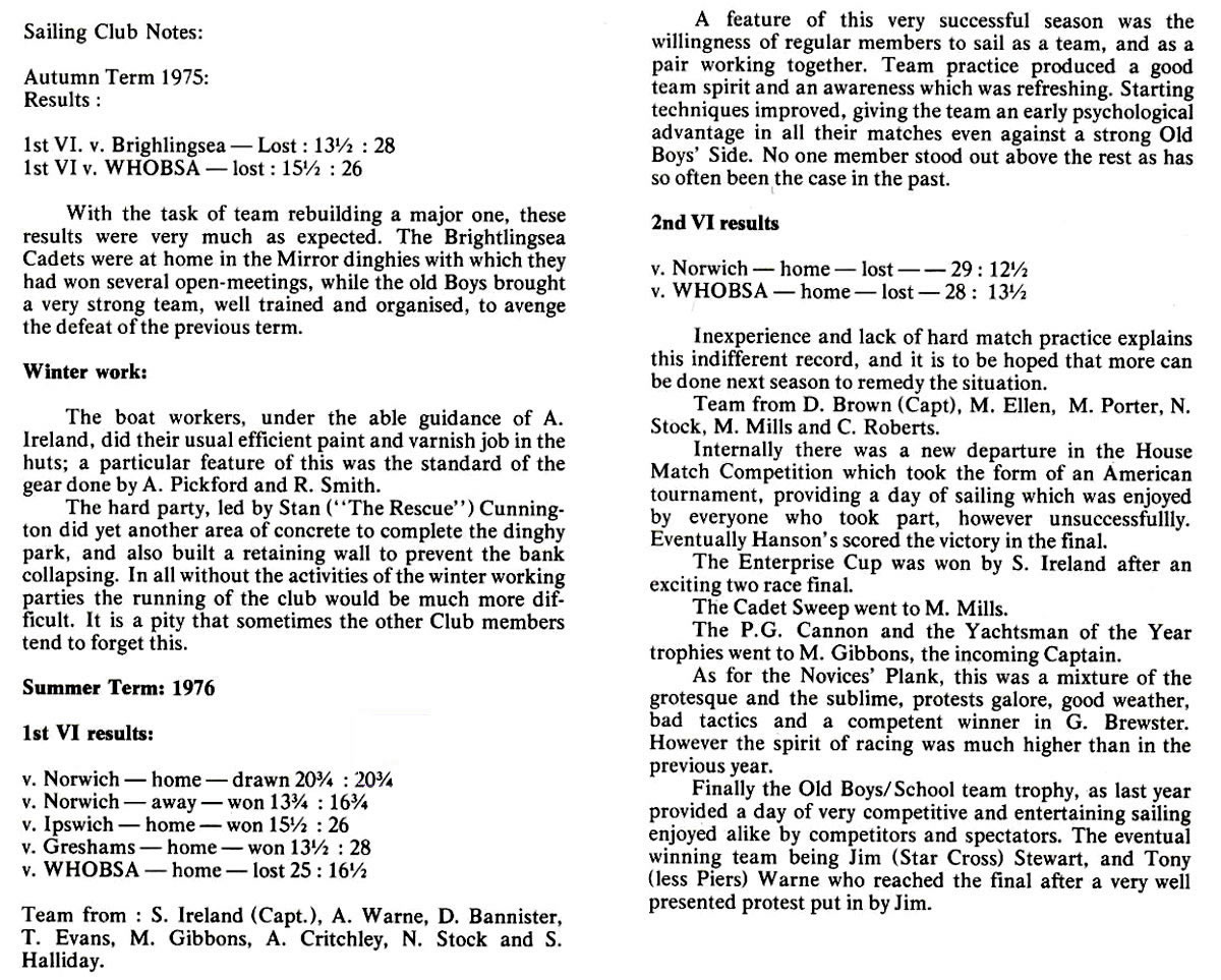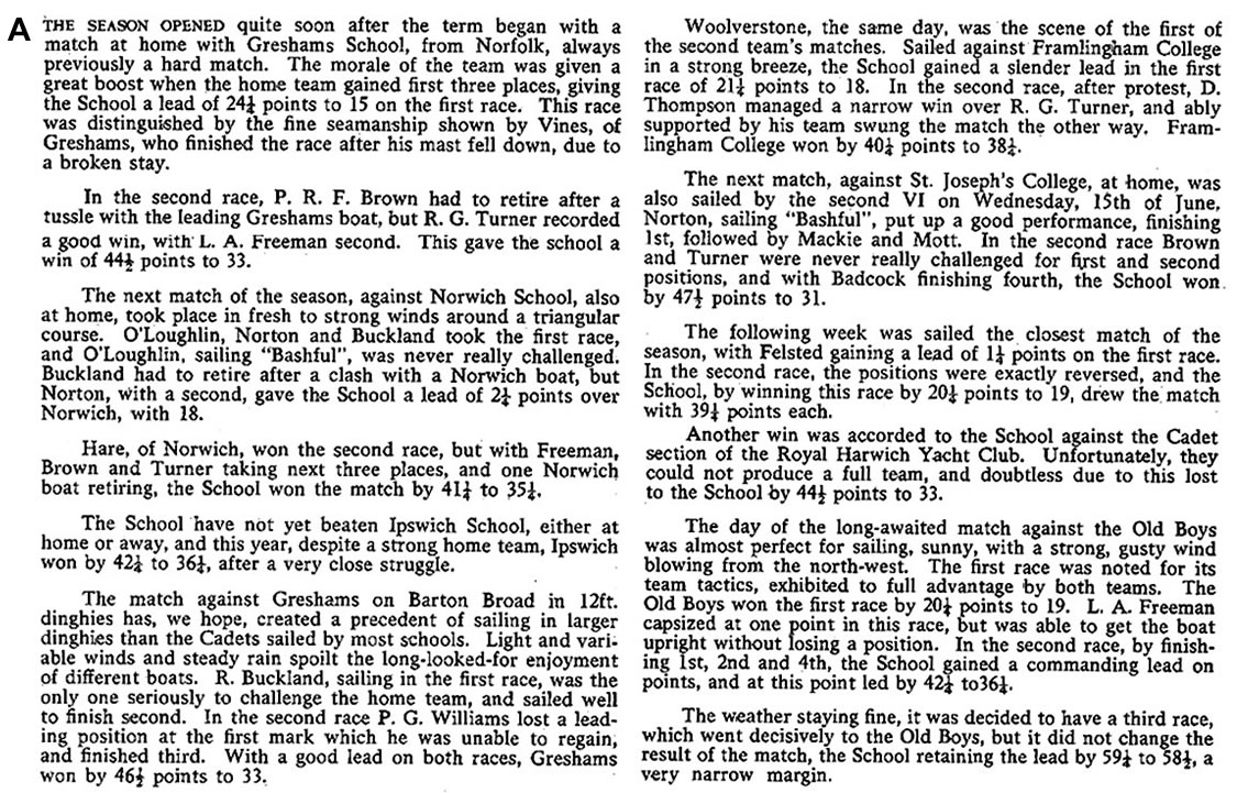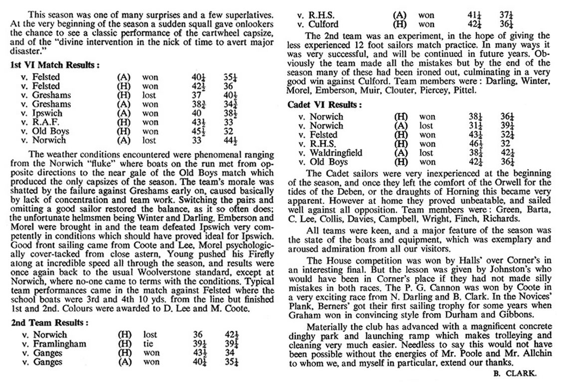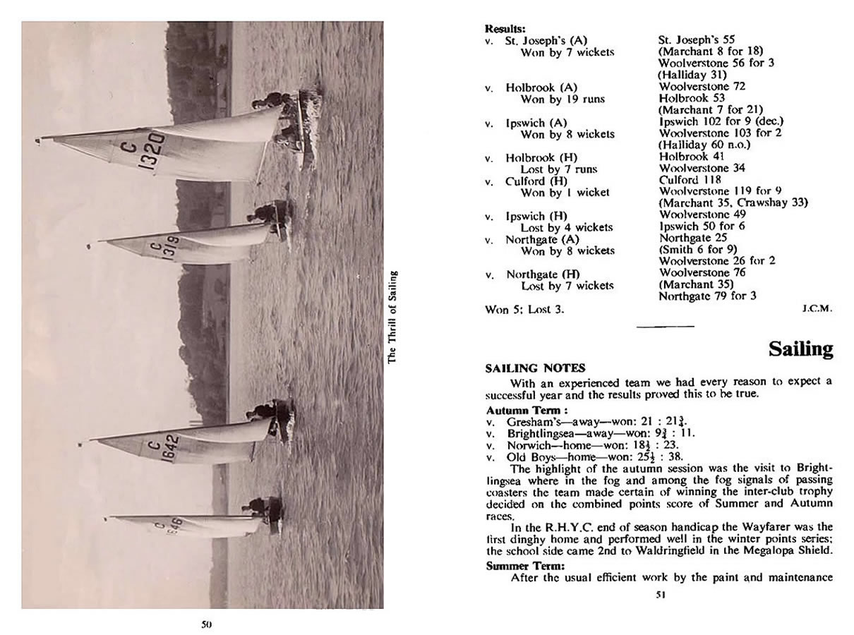- After a shake-down against the Staff, which the School won, we met Gresham's at Woolverstone and beat them 40¼-37¼ but lost the return at Barton Broad 72½-50 - this meeting took place in a strong blow, and our helmsmen never mastered the difficult conditions.