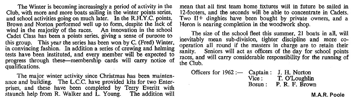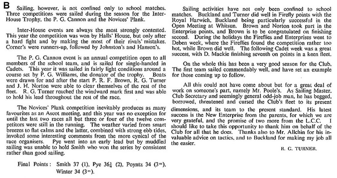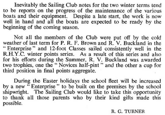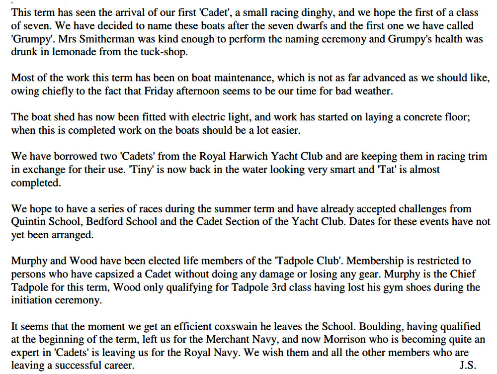 | The Sailing Club has had another successful season from many points of view. While the old sailing dinghy "Syrian Prince" has been pensioned off after a long and useful career, "Sneezy" has joined the other Cadets, and "Snow White" was purchased during the summer term, giving us two Fireflies. It will now be possible to sail off the House matches on a four boat basis, and this will be a most satisfactory system, both from a competition and a training point of view.