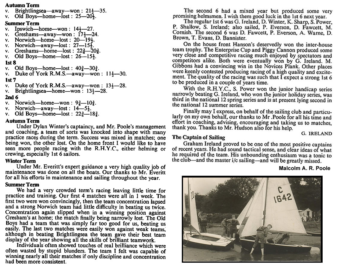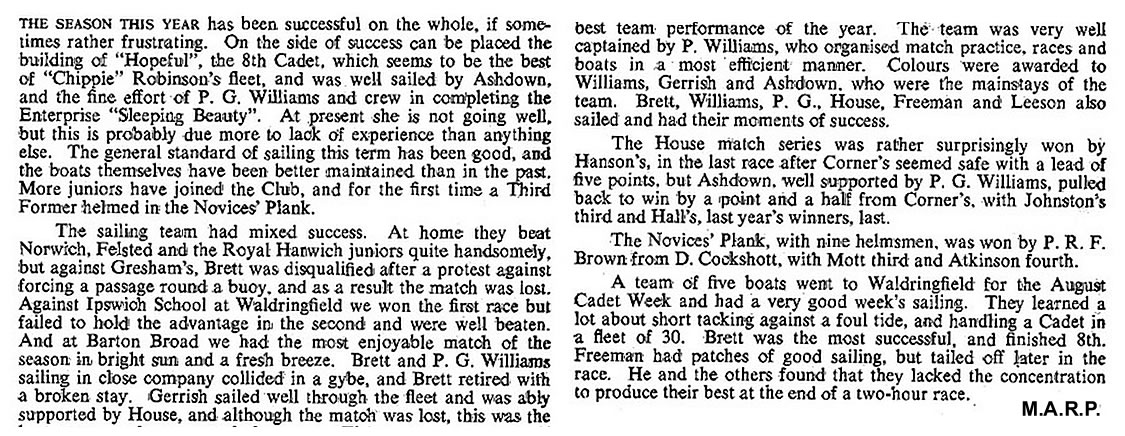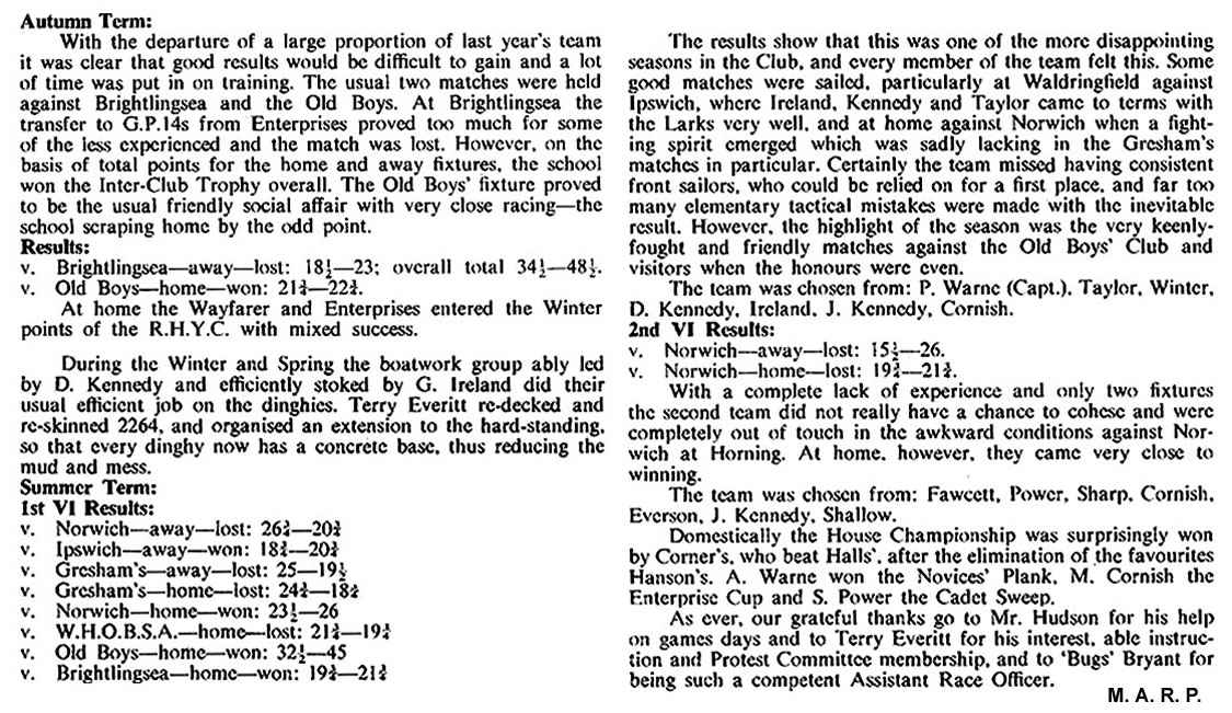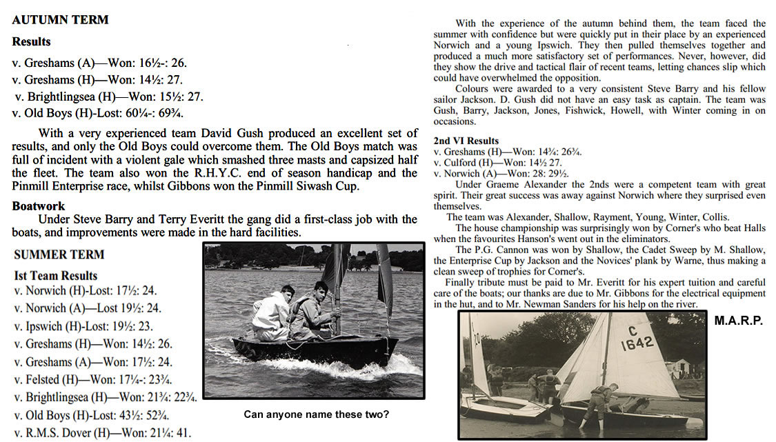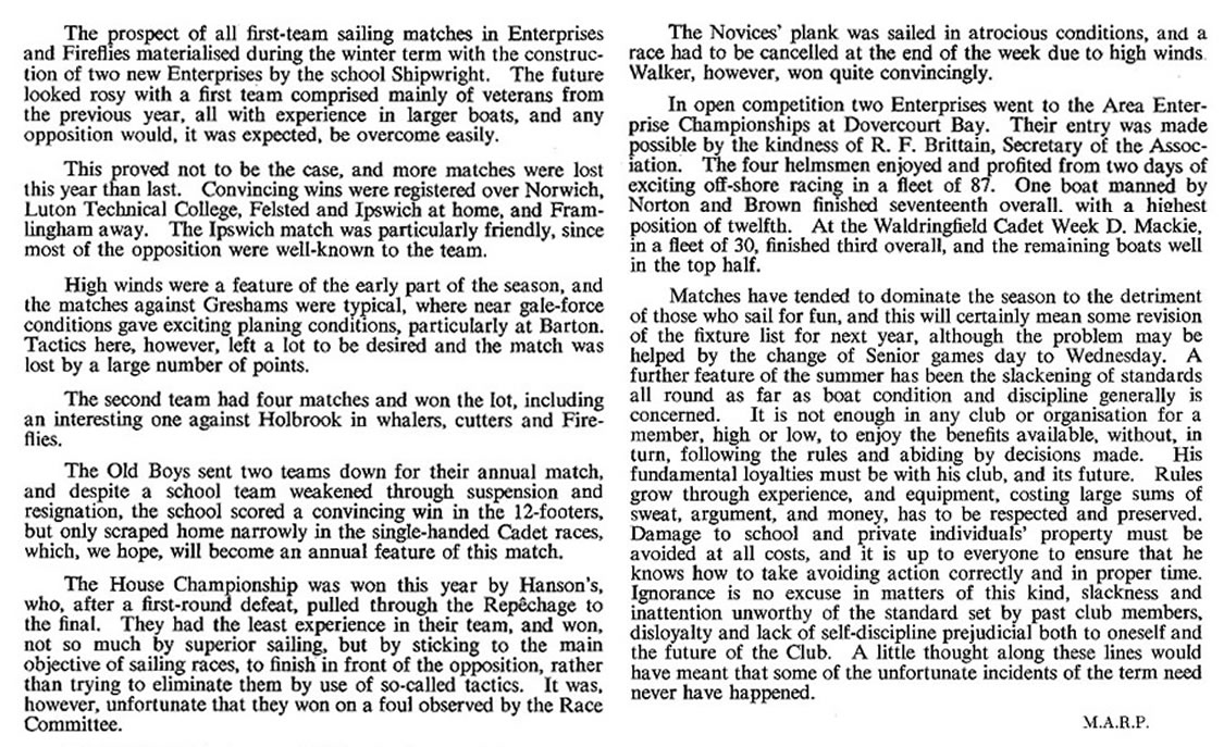 | The greater part of our sailing during the summer has centred around competitive work, as the results show, and though the picture may seem rather black we have achieved some success and gained considerable match experience. After the disastrous start at Greshams, where we were thoroughly trounced and made to look a set of novices by experienced crews, we set to and followed a stern training scheme, with the result that M. Brown beat the best of Greshams in Cadets, and the finishes with Norwich were counted in seconds. We were bitterly disappointed that the tri-angular match was "blown off" as we were thirsting for revenge on the Broads. However, home and away matches, and a tri-angular, are promised for next year, and an Autumn Term match is promised with Ipswich.