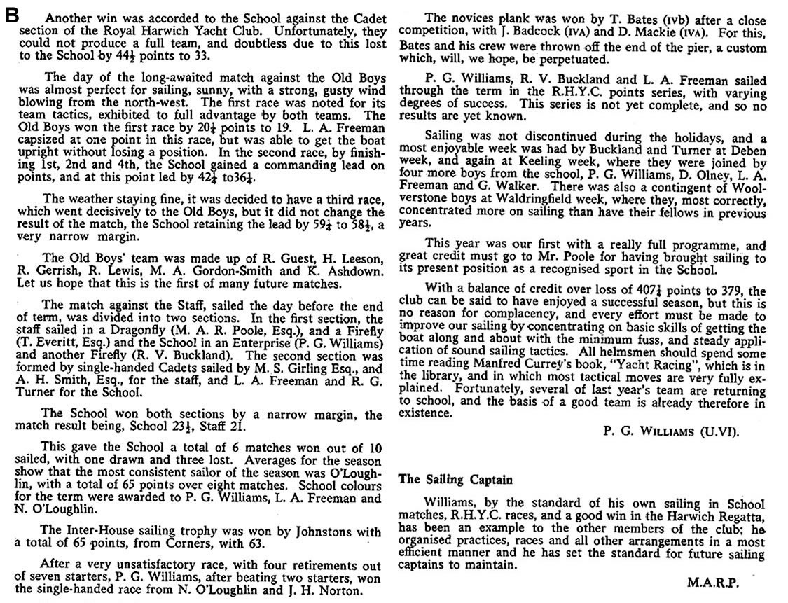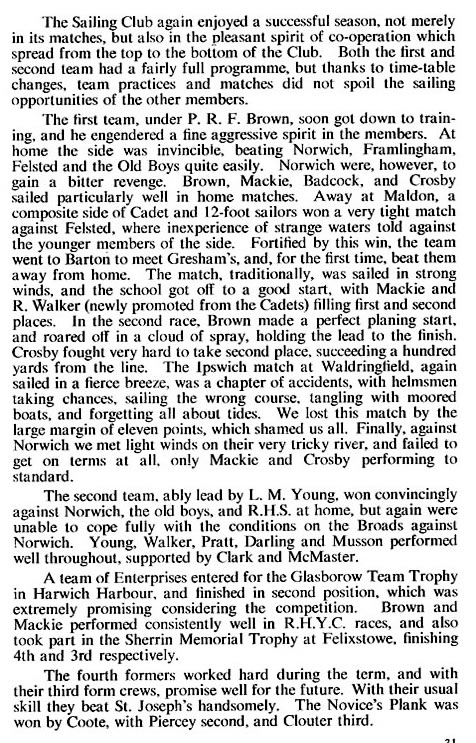 Half-pint Trophy for club racing, and always took part in the club handicaps. Helmsmen were G. Brown, R. Guest and P. A. Williains. In the Keeling Cup, which again took place after a lapse of one year, R. Guest finished third on points, and G. Brown fifth. P. A. Williams was in a borrowed boat, and did not seem to settle down afloat with his very charming crew. And finally we sent one Cadet to the Waldringfield week, and although the crew of D. House and N. O'Loughlin did not shine afloat, they more than made up for this ashore. This visit should again become an annual event, and I hope that more boys will be able to go next year. The "Novices' Plank," competed for by new helmsmen was convincingly won by R. Lewis from A. Glass and R. Gerrish. Finally in the Harwich Harbour Regatta, G. Brown and R. Guest sailed in the Burton Cup for Fireflies; and at the Ipswich Regatta