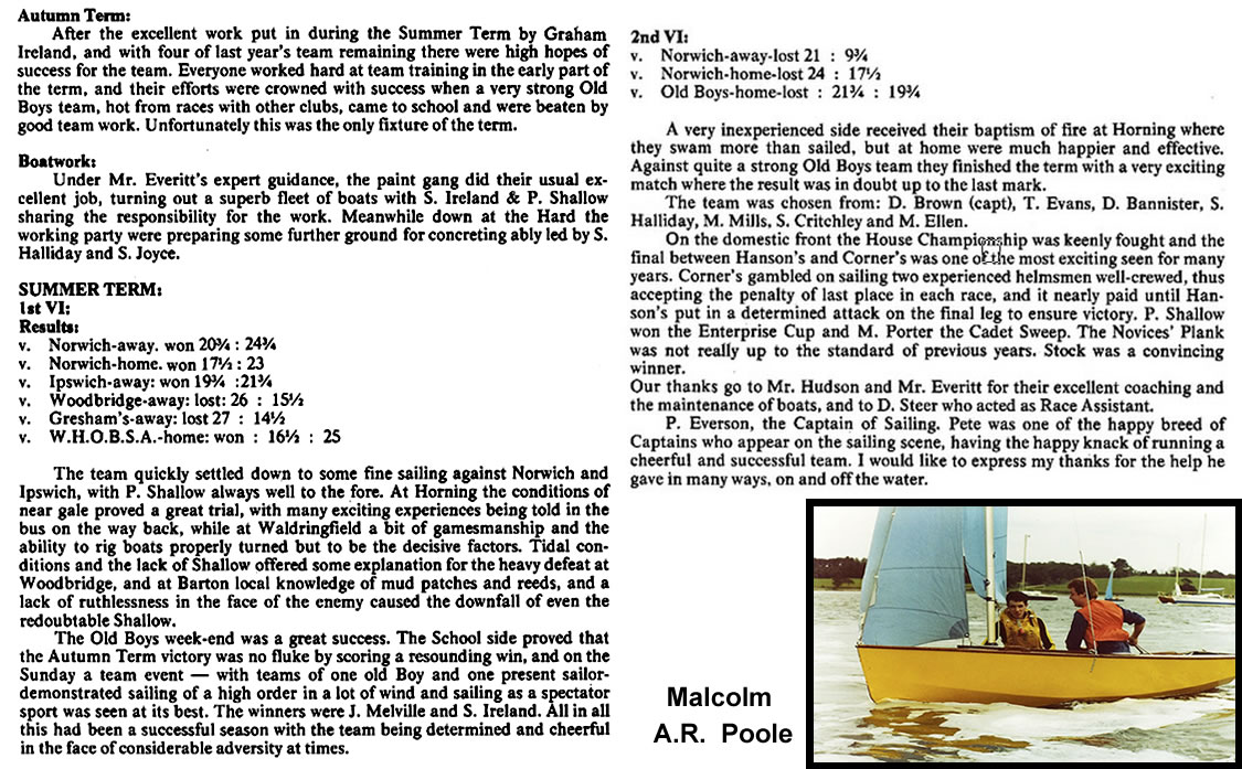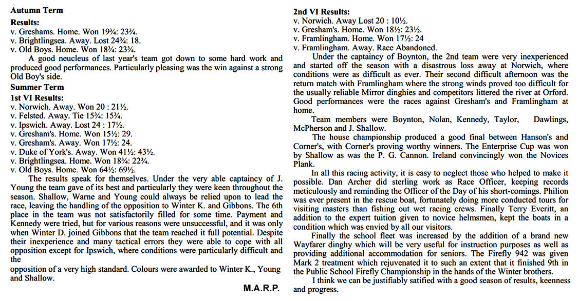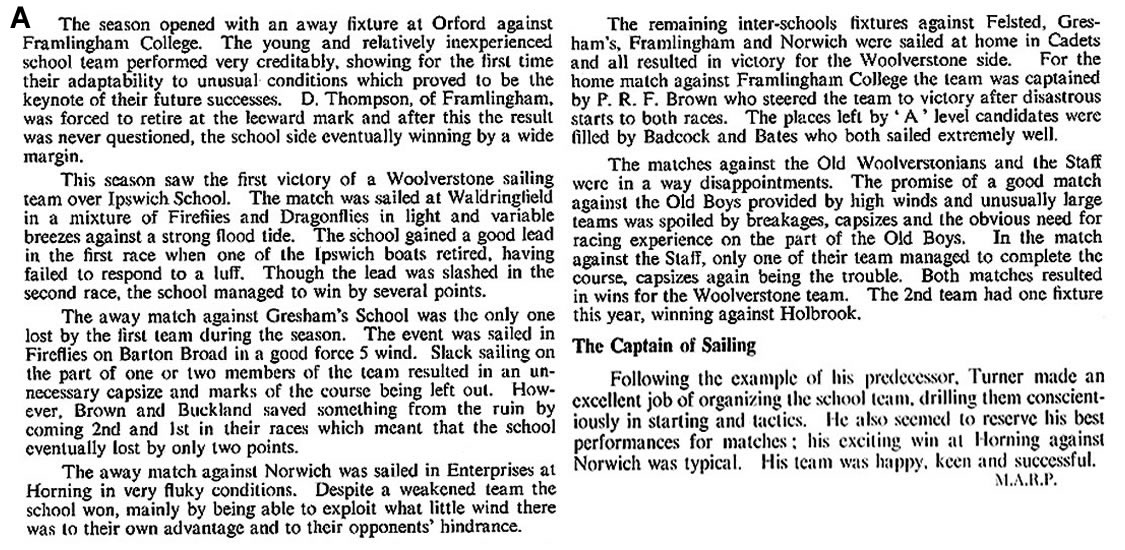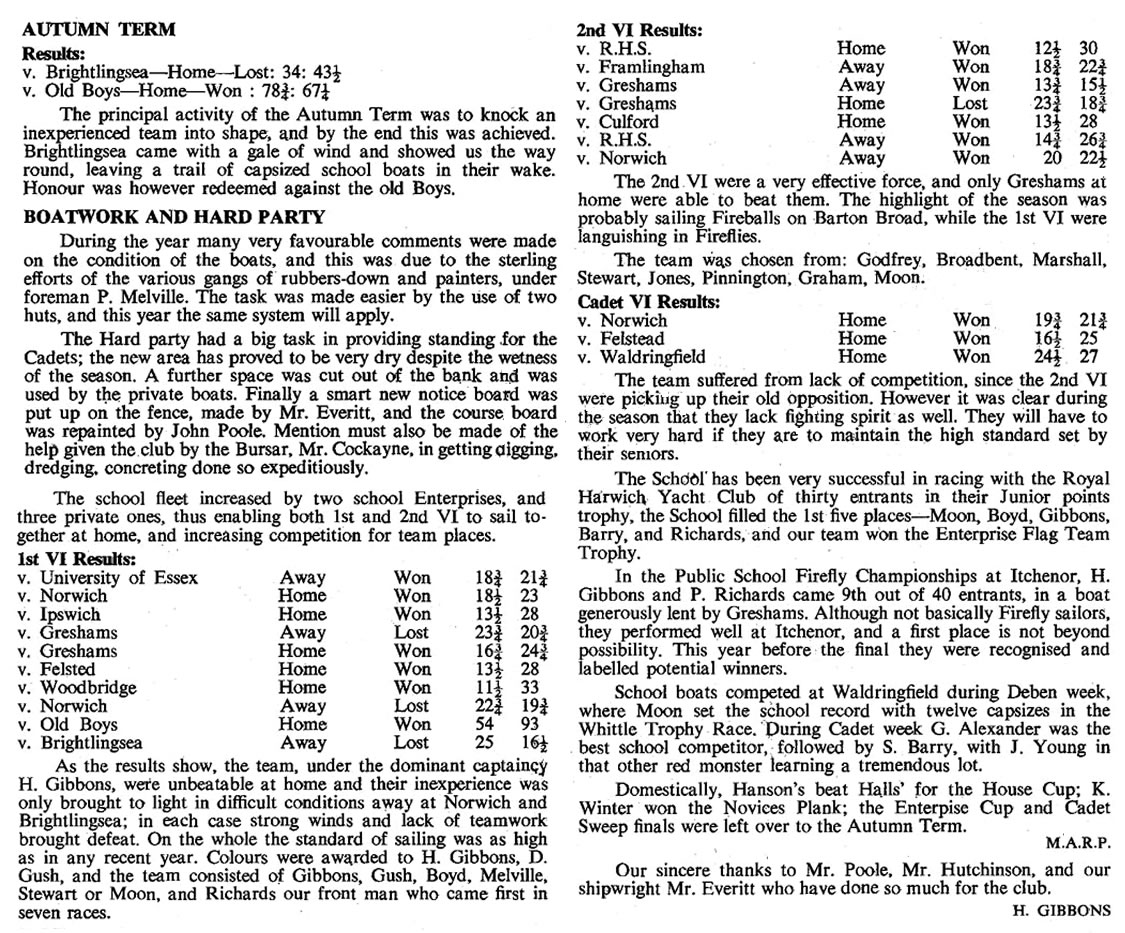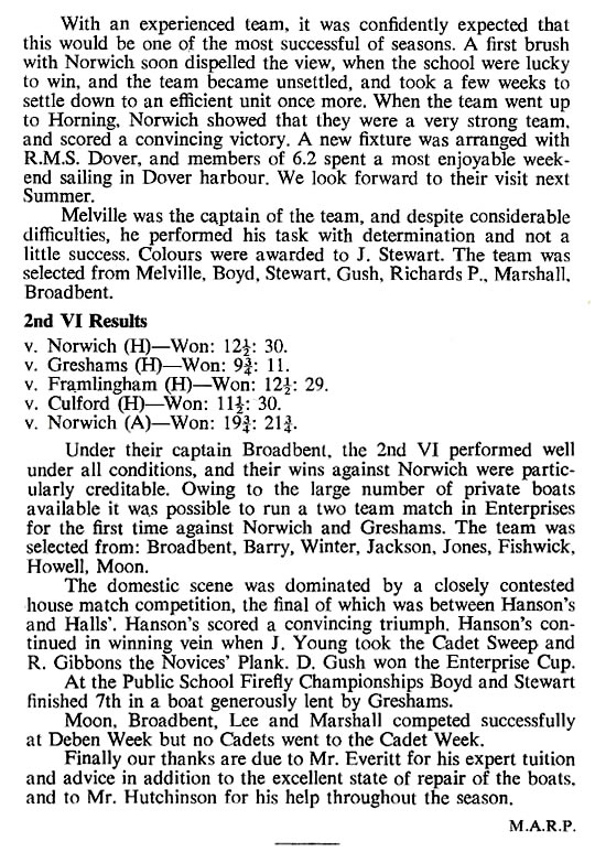 The match against Norwich was very close, with A. Jones picking up two places in the last 20 yards before the finishing line, and G. Brown having a very good first place in Sabrina. Norwich won 40½-38¼. But against Ipswich, the School were well beaten at Waldringfield, by 46½ to 33. The feature of this race was the way our boys persisted in racing against each other, so allowing the Ipswich team to get into an unassailable position.