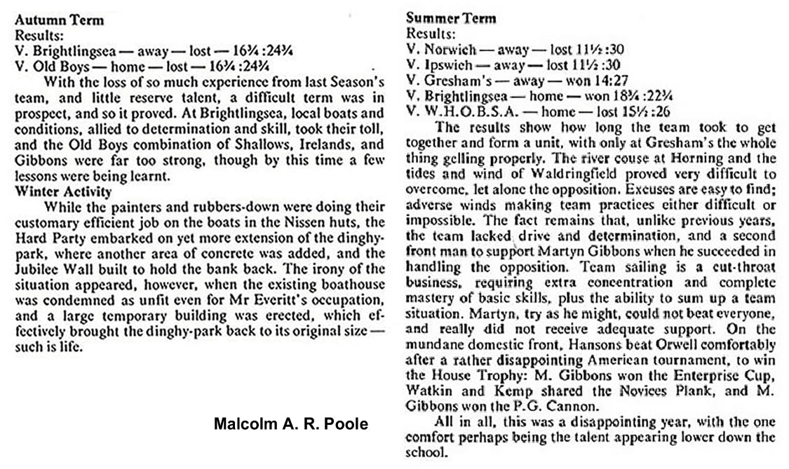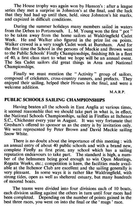 The House Competition, sailed in teams of two boats, was narrowly won by Halls with Corners second and Hansons third. Everything depended on a Corners boat hitting a turning mark. Hansons are to be congratulated on the performance of their two novice helmsmen. The Novices' Plank. with an entry of 11, proved very exciting, and was finally won by B. Sandland, with K. Ashdown second and A. Brett third. During the holidays many boys returned to the Orwell and the Deben to sail - Williams and Sylvester during Deben Week, the same two and Bauer and Baguste in the Keeling Cup, and no less than 13 boys took part in the Waldringfield Cadet Week. A camp was arranged and six boats taken across and they performed very well indeed. Lewis and Gerrish ultimately finished tieing in fourth place in a fleet of 20 boats. They and Brett often led the race, and our dark blue hulls were much admired, even the Banana boat, which had the opposition very worried before racing started. Finally, the best feature of the year has been the co-operative spirit amongst the boys, hich, together with the help of Mr. Goetzee, has made this season so enjoyable.