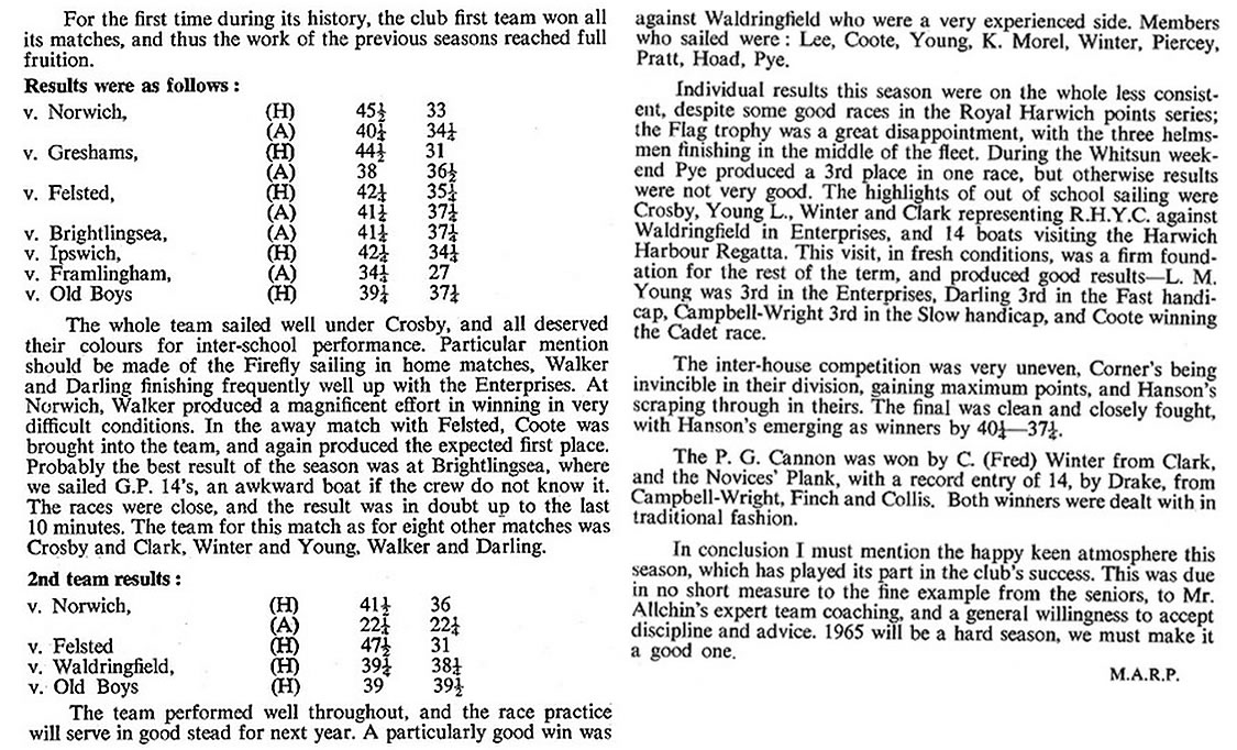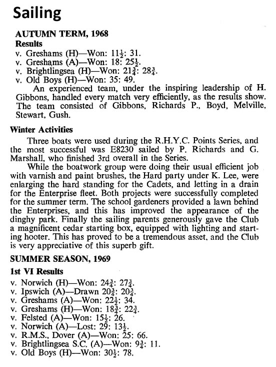 In individual racing boys have done very well. The School Fireflies won the Harwich