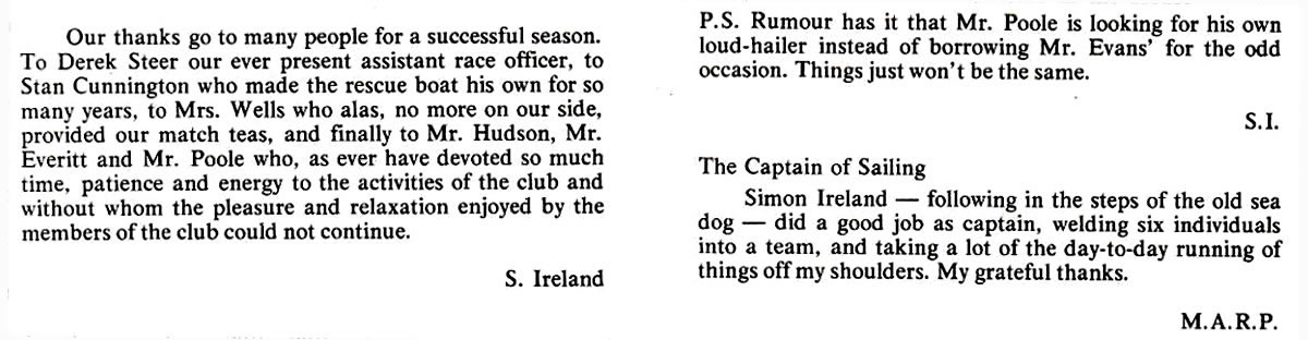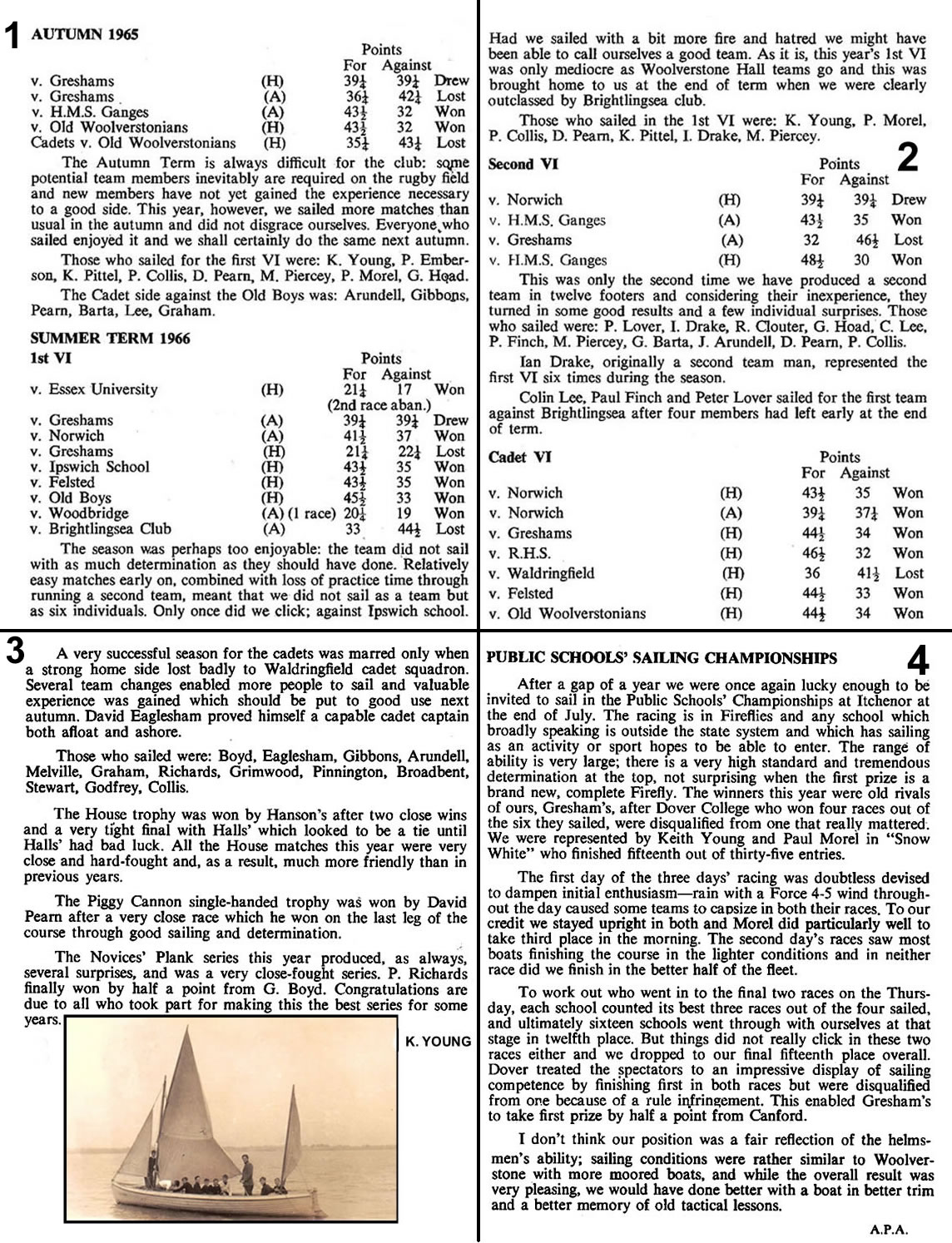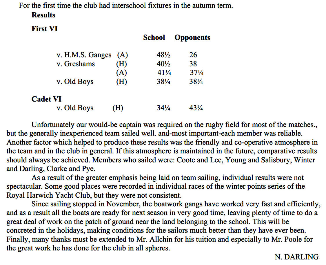 As the club had only two Cadet-class racing dinghies, a rota had to be worked out so as to enable all four Houses to race each other the same number of times before the end of term. When all the points had been added together for the term, Corners House was found to have turned out on top with the greatest amount of points, thereby gaining the honour of holding the cup for the first time.