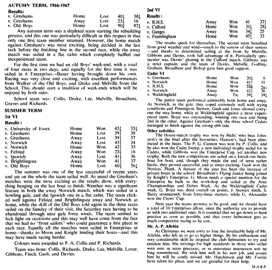 - Unfortunately it was not possible to arrange an Old Boys' match, but with more helmsmen leaving this will not be the case next year.