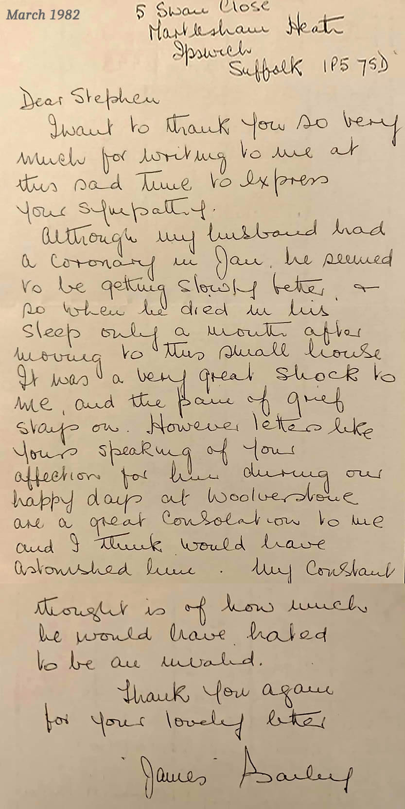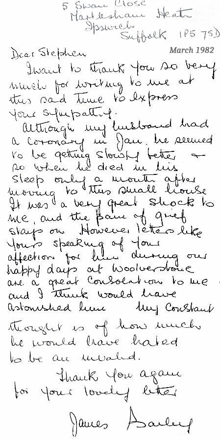 Louis Parperis: - Orwell 63-70: I am clearing out a lifetime’s accumulation of things I have retained for a variety of reasons, some probably being no more significant than that I put them into a drawer and forgot about them. I will not be keeping this letter any longer, but it was a pleasant surprise both to come across it today and to be reminded of how the late Mrs Bailey revelled in the nickname her husband, the headmaster during the years I was at Woolverstone, used so fondly. |