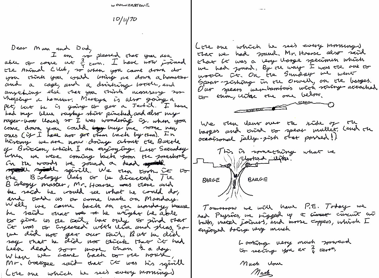 Woolverstone Hall Woolverstone 10 / 11 / 70 Dear Mum and Dad I am pleased that you are able to come at ¾ term. I have now joined the Animal Club, so when you come down do you think you could bring me down a hamster and a cage, and a drinking bottle, and anything else that you think is necessary for keeping a hamster. Martyn is also going (to keep) a pet but he is going to get a Jerbil. I have had my blue rugby shirt pinched, and also my ruger boot laces, so I was wondering if, when you come down you could buy me some new ones (if I have not got them back by then). In history we are now doing about the Battle of Britain, which I am enjoying. Last Saturday when we were coming back from the foreshore in the woods we found a dead sqirill. We then took it to the Biology labs to be dicected. The Biology Master, Mr Hoarse was there and he said he would see what he could do and told us to come back on Monday. Well, we came back on the Monday because he said he might be able to give us the tail, but only to find that it was to infected with lice and fleas. So we did not get our tail. But he did say that he did not think it had been dead for more than ½ a day. When we came back to the house Mr. Goetzee said that it was his sqirill ( the one which he sees every morning) that we had found. Mr Hoarse also said that it was a very large specimen which we had found. By the way I was the one to notice it. On the Sunday we went spear-fishing in the Orwell, on the barges. Our spears were bamboos with string attached to them, like the one below. We then lent over the side of the barges and tried to spear mullet (and the occasional jelly-fish that passed). Tomorrow we will have PE. Today we had Physics, we rigged up a circuit with bulbs, metel joiners, and morse tappers which I enjoyed doing very much.Looking very much forward to seeing you at ¾ term. Much love |