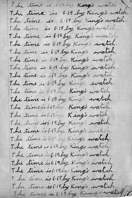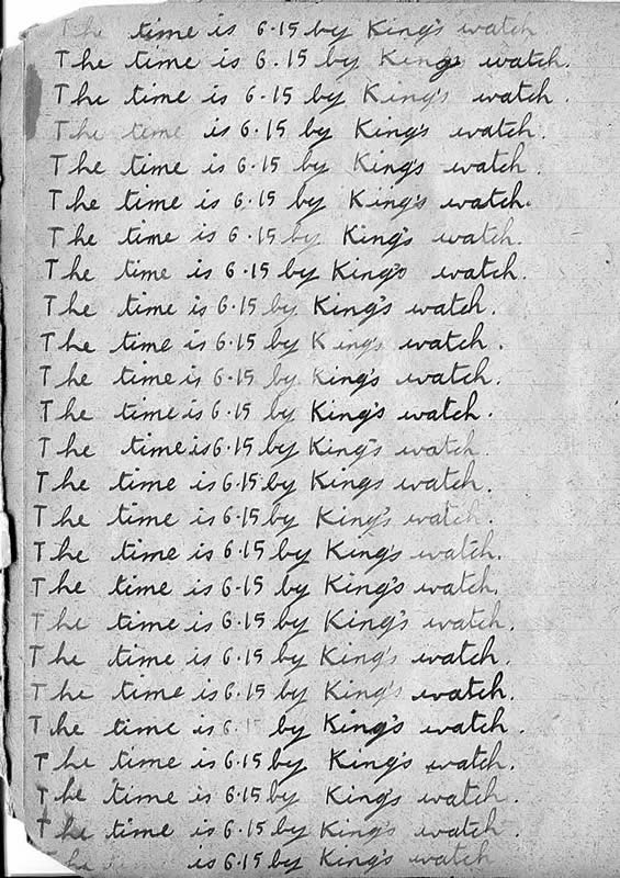 Mike O'Leary writes: I was just looking through some old school books and notebooks of mine when I was at Woolverstone and I found these! By the stuff in the notebook next to them, the date must be my first term there in 1957. I don't remember anything about the occasion but I must have asked Alan King what time it was during prep and the teacher/monitor heard me and gave me lines (50, I've counted)!!!