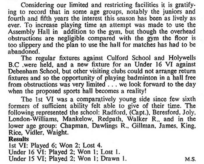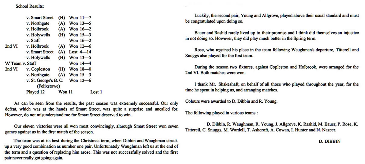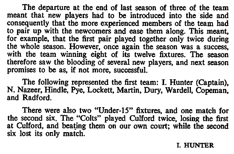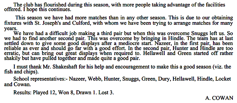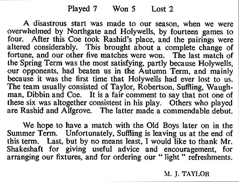 During the term we played four games, winning three and losing one, a further fixture against Culford being cancelled, but it is hoped to play against this school next season. The School was represented by Pinney and Stevens; Leach and Worsley; and Smith G. and Glaysher. Without wishing to assess the individual merits of any of the team, I think that mention should be made of Leach, who, despite his lack of age and size, more than held his own against the best of his opponents.