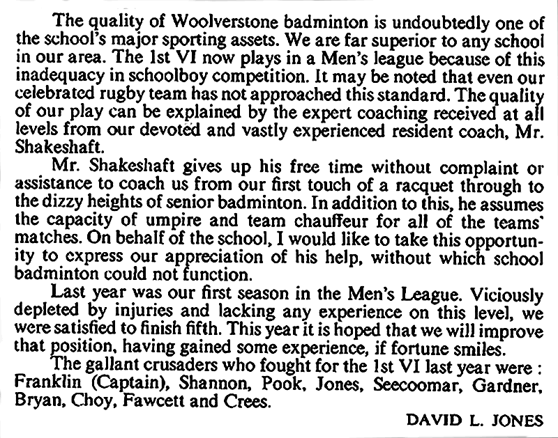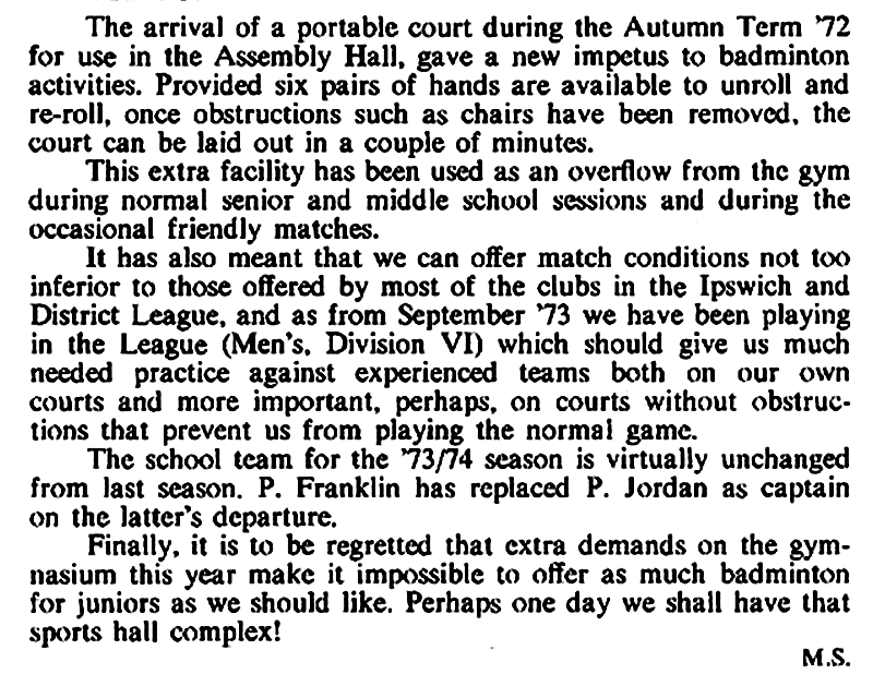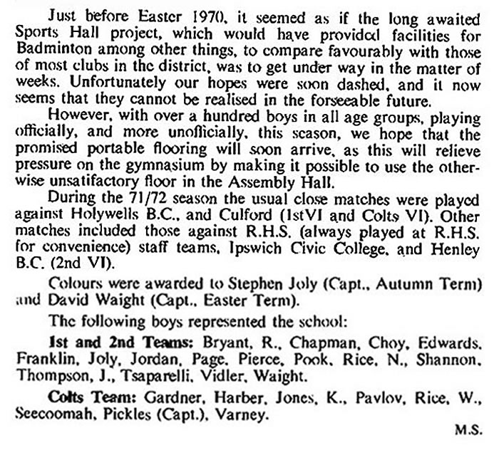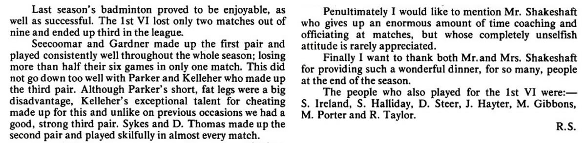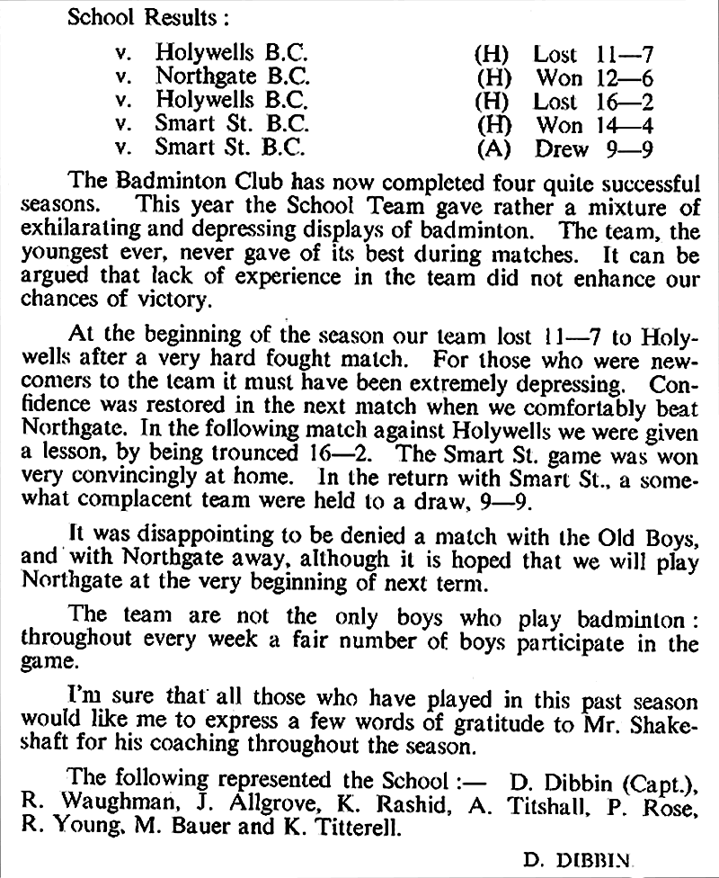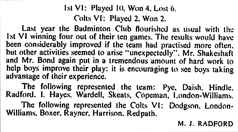 THIS TERM badminton, under the guidance of Mr. Shakeshaft, was given recognition as an official school sport, for which colours may now be awarded.