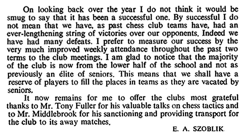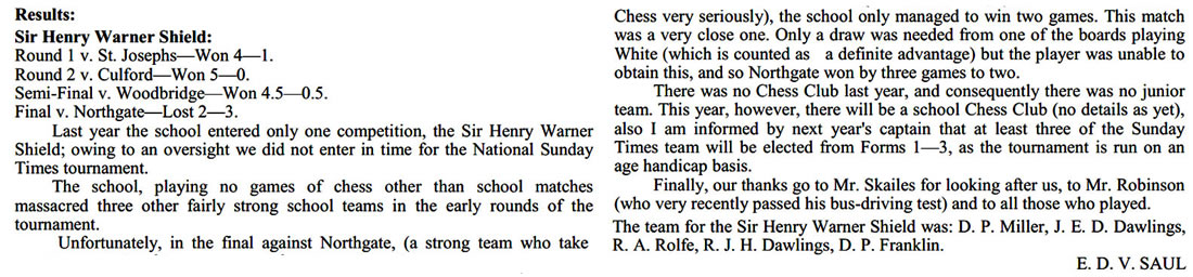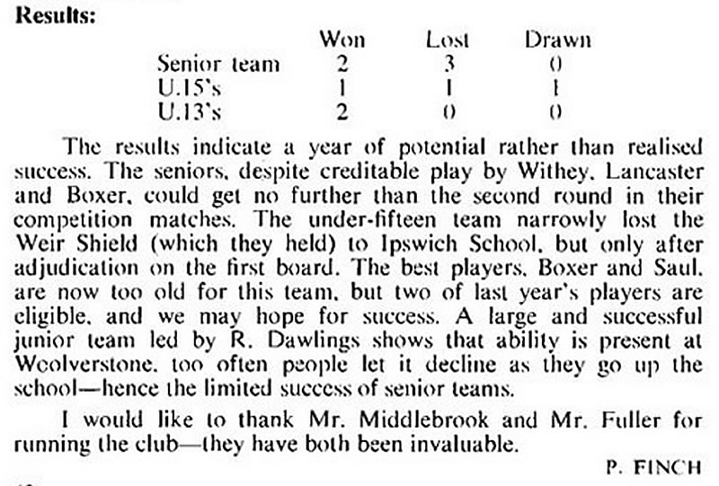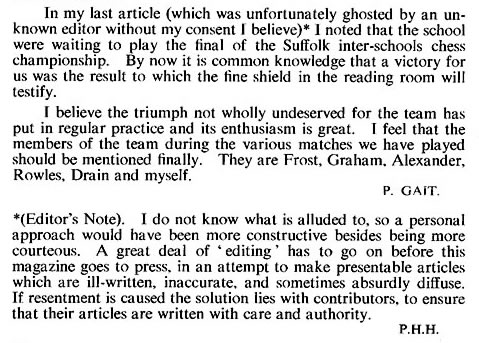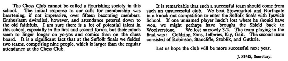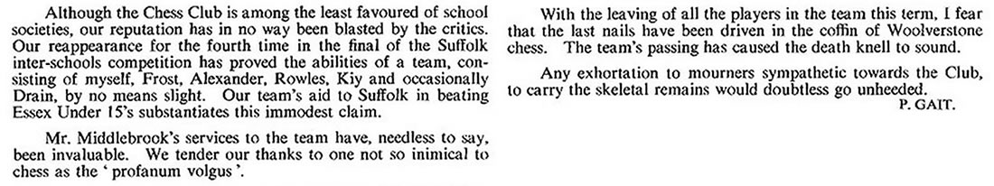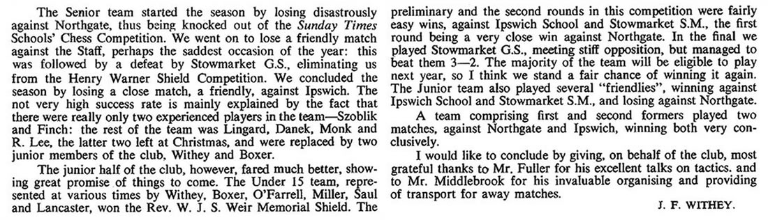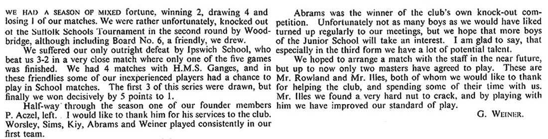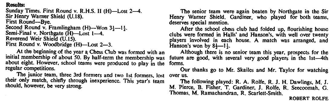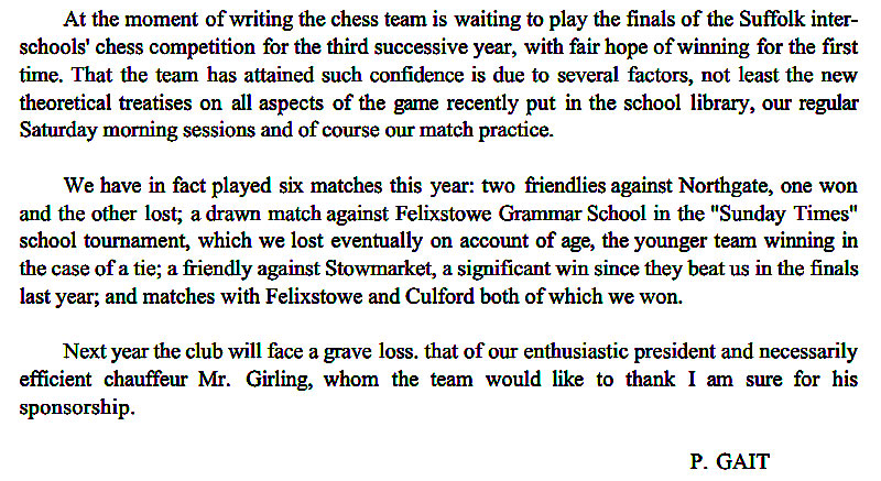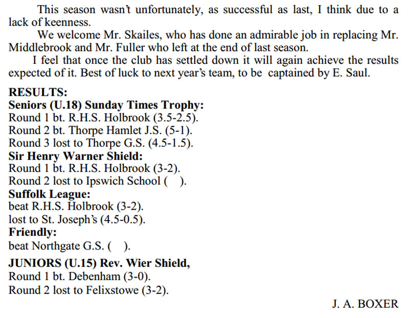 On our return to school this year we were greeted by the news that we were drawn to play Felixstowe G.S. in the Suffolk Schools' Chess Competition. Owing to the 'flu epidemic, however, the match was postponed. At the moment we are arranging a date for the match, which should be played at home. We hope to do well in the competition, although Felixstowe are reputed to be one of the best schools participating.We must thank Mr. Rowland for placing his room at our disposal, helping to run the Club and also for entering us for the Schools' Competition.