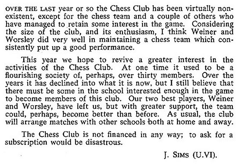 AFTER A LONG period of inactivity the Chess Club reappeared in September, 1956. In the first few weeks membership rose to the forties. Eventually, however, it was only a few old faithfuls who attended regularly. During the summer term the Club underwent another period of inactivity which was due to the good weather.