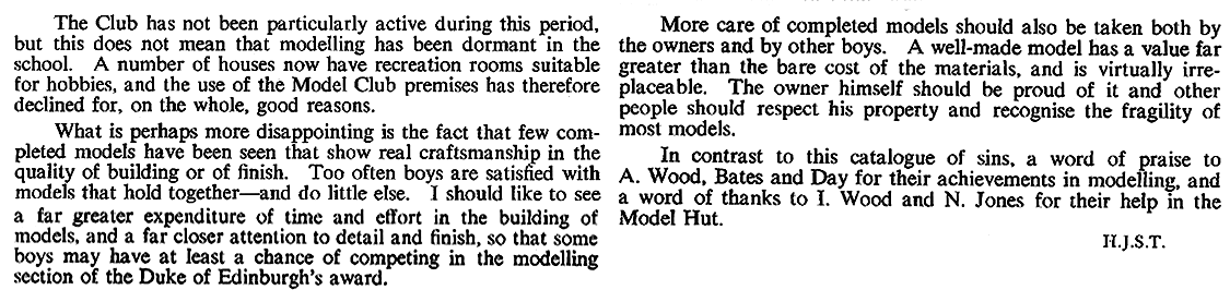THE MODEL AIRCRAFT CLUB is now firmly established It was started by Mr. Mudd buying kit and accessories for his House, Orwell House. The "bug" soon spread around and reached its climax at the end of the Spring Term. As a result of the many people who bought kits, it was decided to form a Club for the modellers. The craze soon died out, leaving only the keener modellers. The aircraft made covered a wide range from "Chuck Gliders" to Control Line" models. As yet no "Free-Flight" models have been made, but it is hoped in the future that there will be some constructed.