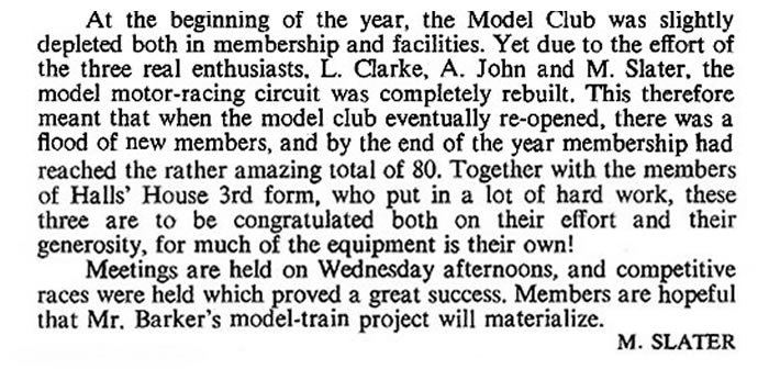 The standard of aeroplane construction is gradually improving and the younger members of the Club have made some very good aeroplanes. J. Bates' "Planfour Mite" was undoubtedly the best, and his generosity in letting his Form mates "have a go" was appreciated by all, as it was their first attempt at "Control-Line". So far we have built only "Team Racers" and "Trainers", but next term "Stunting" and "Combat" will be attempted. This is much more fun! Surprisingly enough, the Model Aircraft Club incorporates model boats also. This last term has seen more interest in model boats, but at the moment, Hansons seem to have the monopoly, with a large battery-powered launch and a Diesel-powered launch; the latter has not been finished yet, so its performance is still unknown.