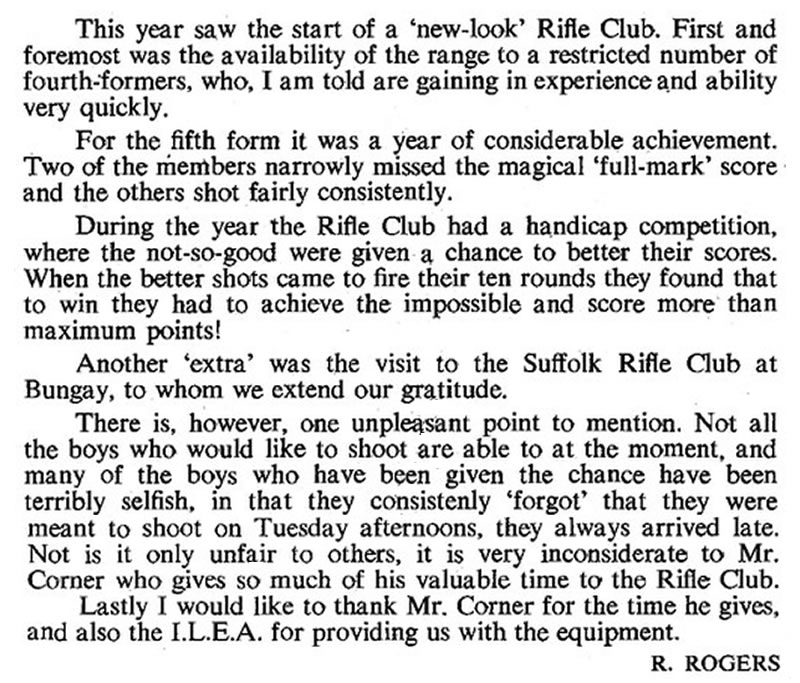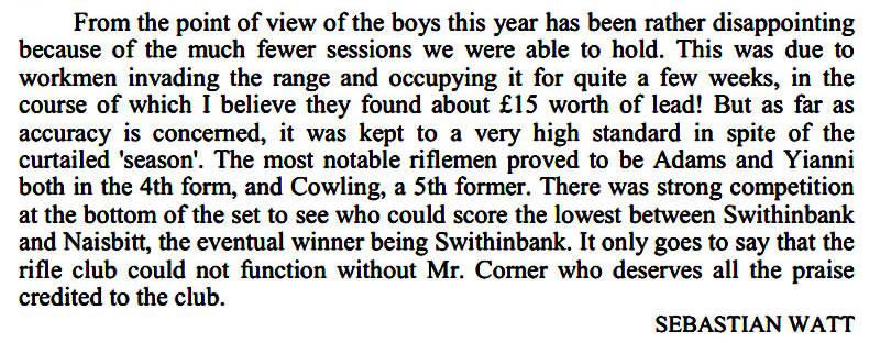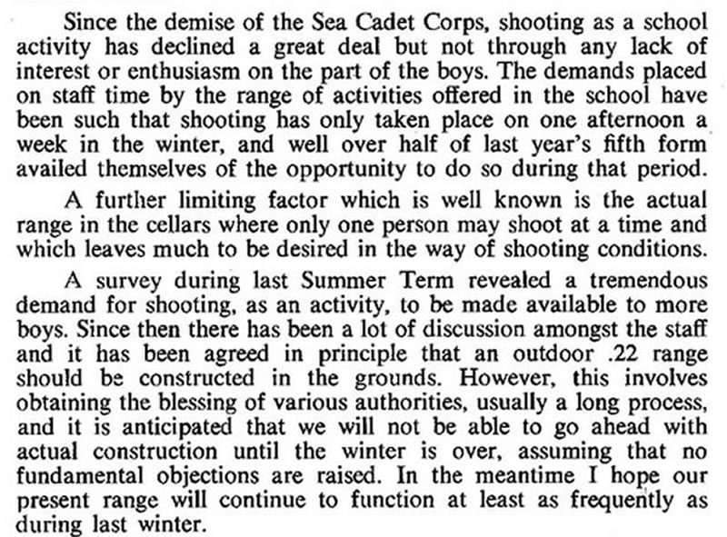 - A./L.S. Moss, O.S. Hardy, A./L.S. Hunton, O.S. Harrington and A./L.S. Glass (D.)-have reached the standard of 85 out of 100 required for the "Good Shooting Badge." When we have built the .22 range at school, as is under discussion at the present time, this number will be greatly increased, as will our shooting activities in general.