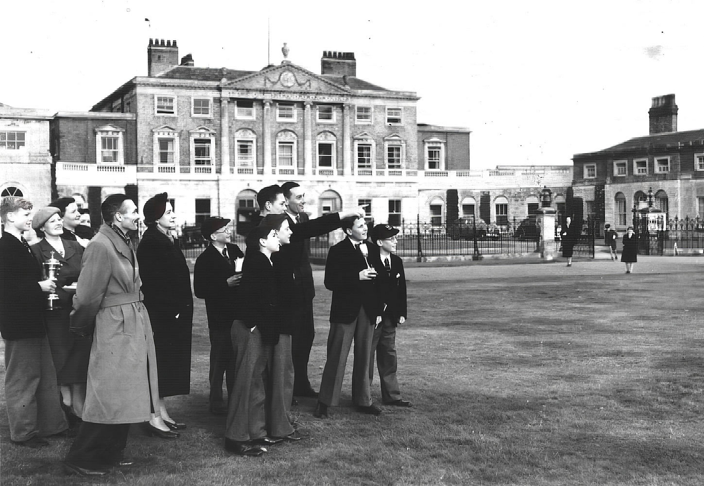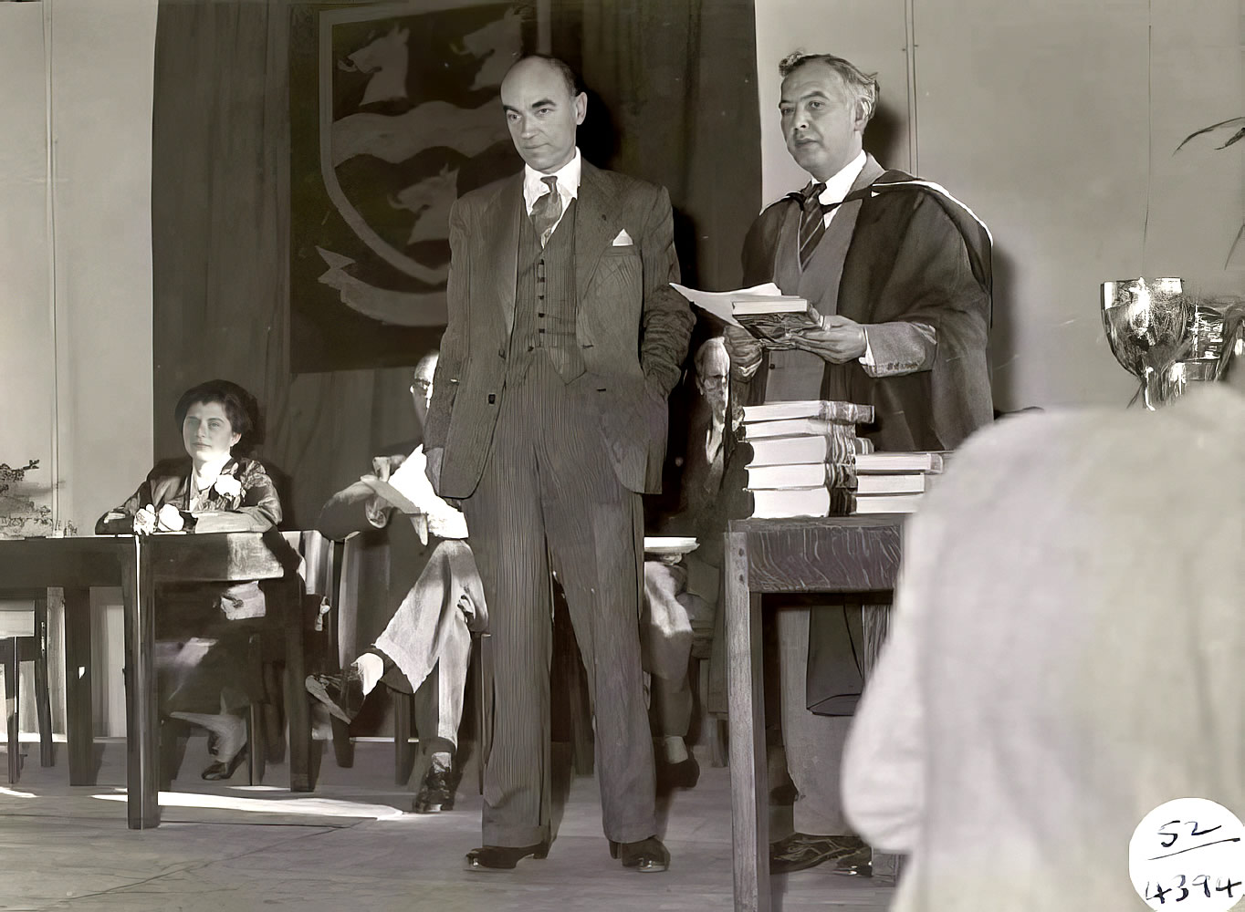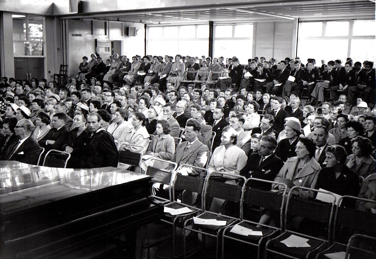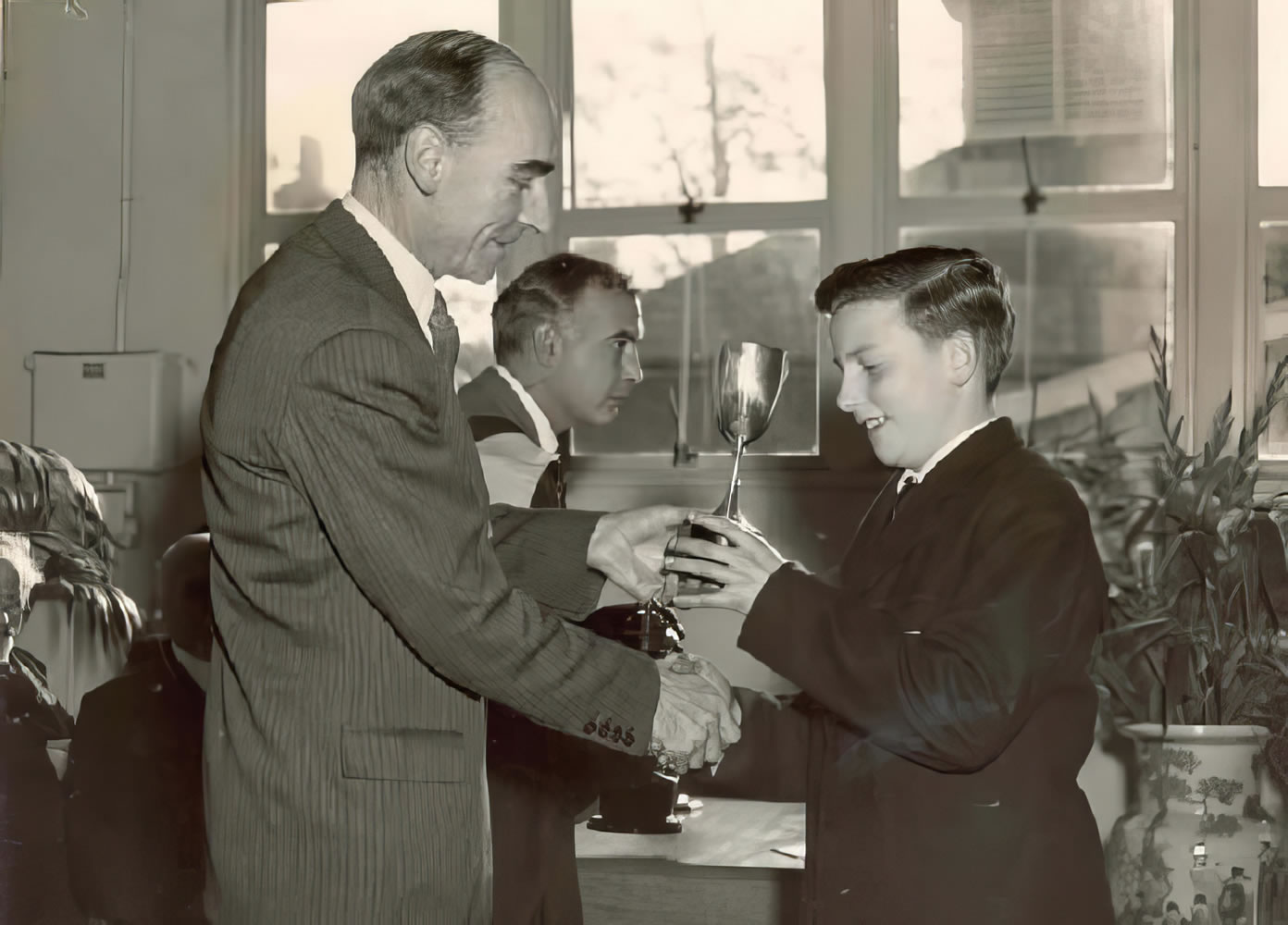 | From Speech Day, 1952: Identifiable prizewinning boys are Ian McCulloch (extreme left), Gilbert (with specs in centre), Robjohns (pointing), Brian Workman and A Jones (hand in pocket), John Scarbrow (holding cup) and Brian Jenkins (in specs and cap at right). The adults are all parents. From Brian Jenkins - June, 2005 |
