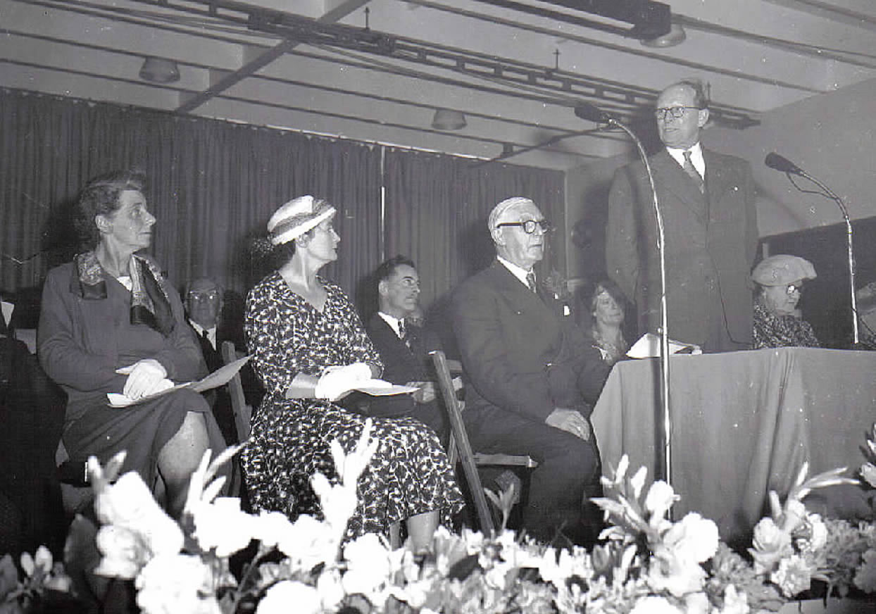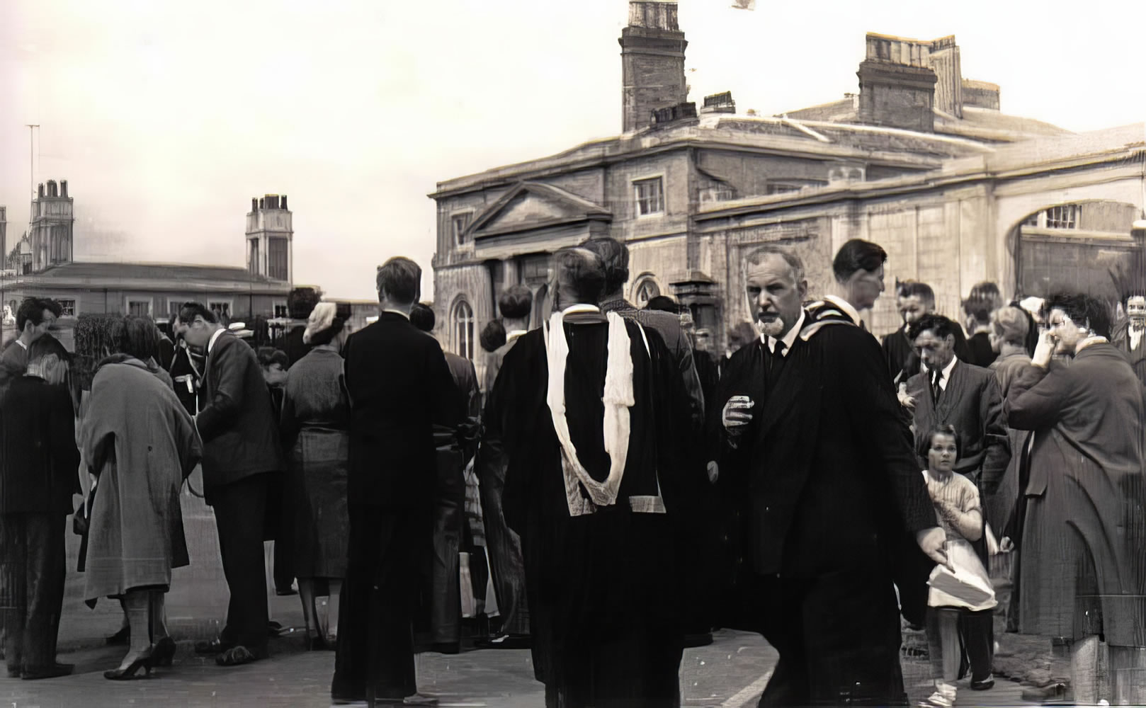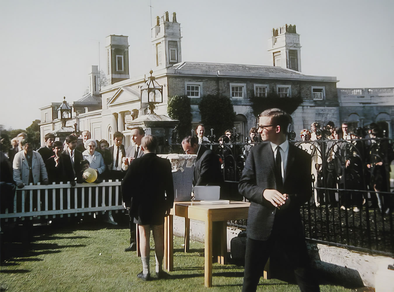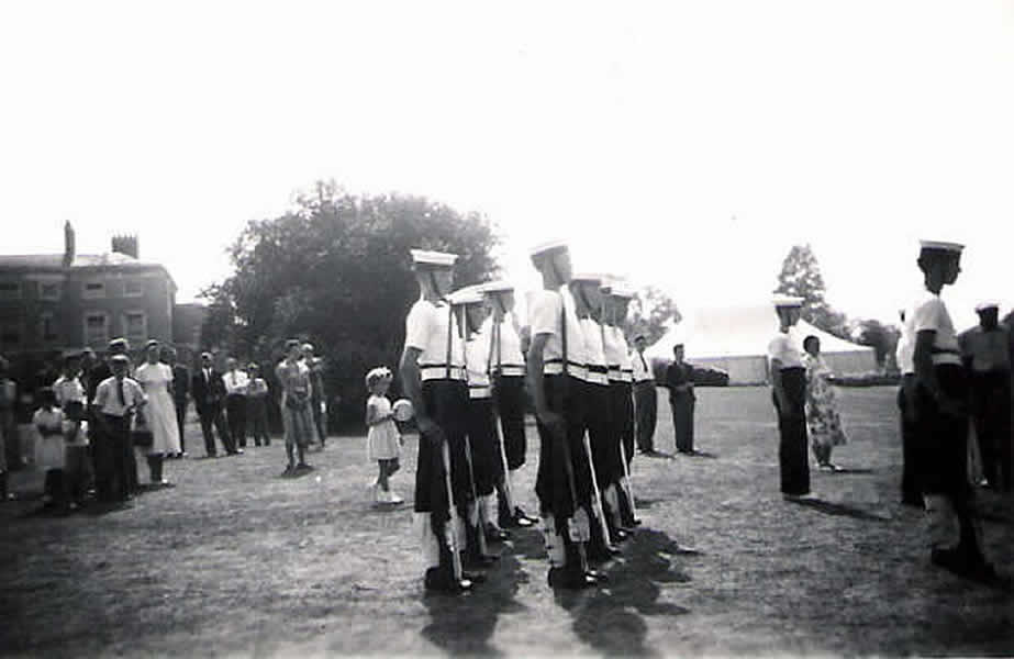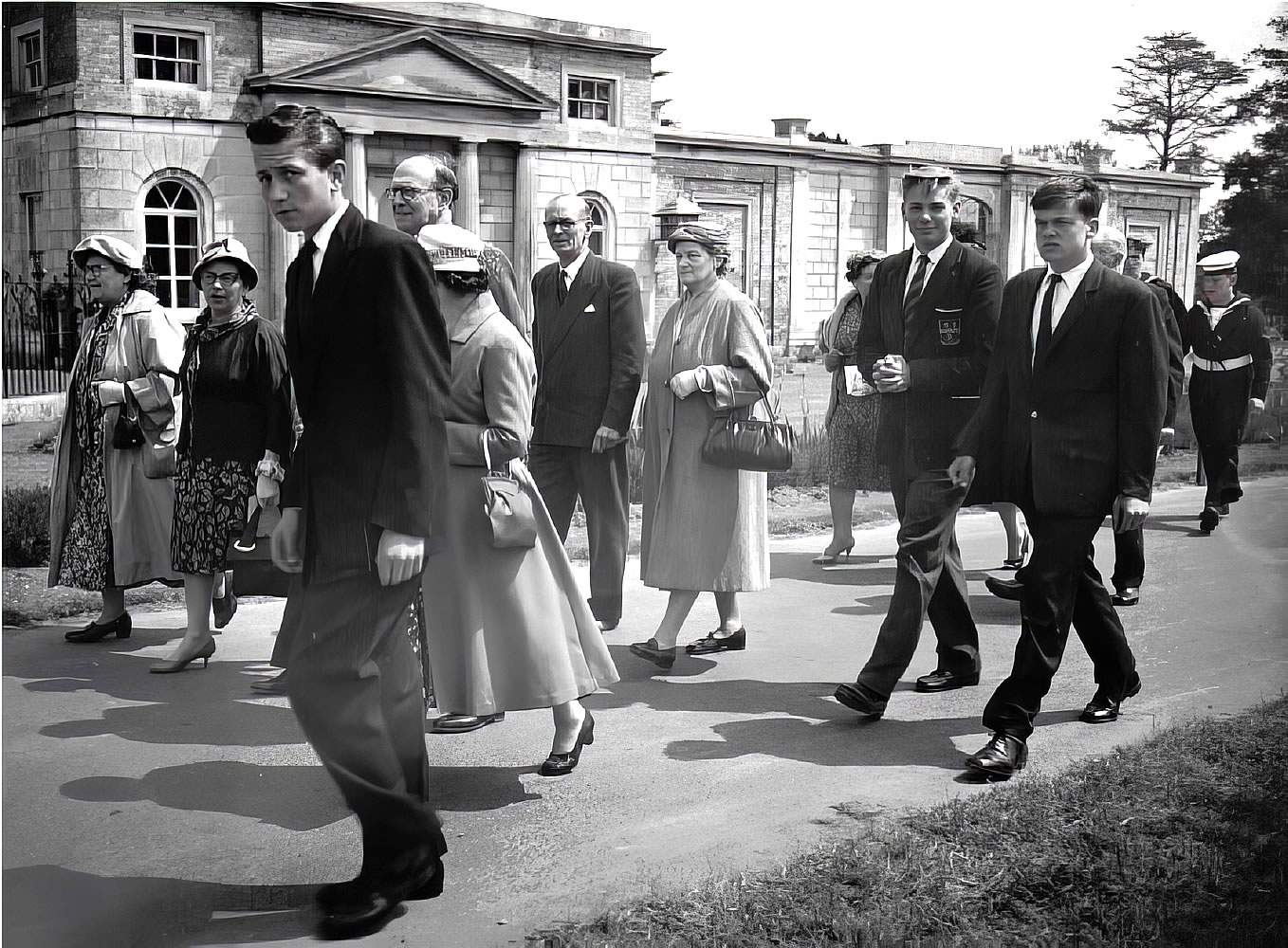 | From Speech Day, 1952: Identifiable prizewinning boys are Ian McCulloch (extreme left), Gilbert (with specs in centre), Robjohns (pointing), Brian Workman and A Jones (hand in pocket), John Scarbrow (holding cup) and Brian Jenkins (in specs and cap at right). The adults are all parents. From Brian Jenkins - June, 2005 |