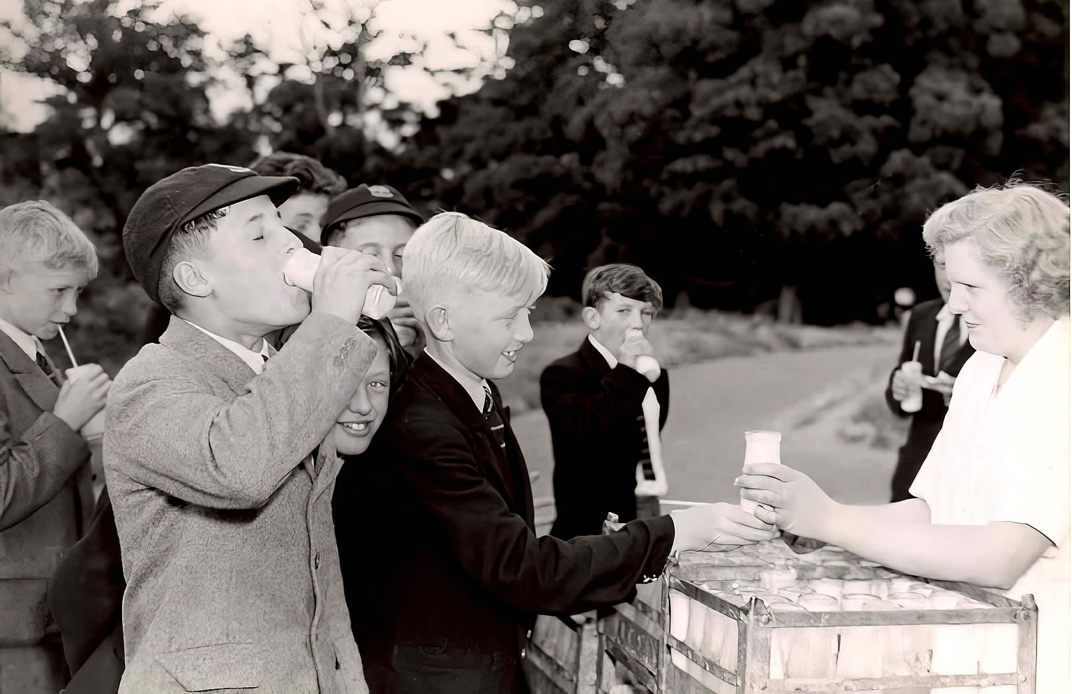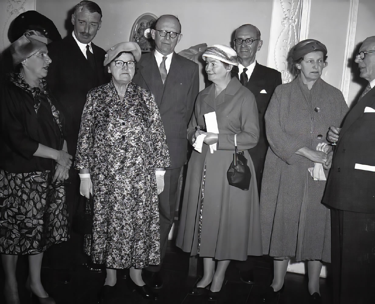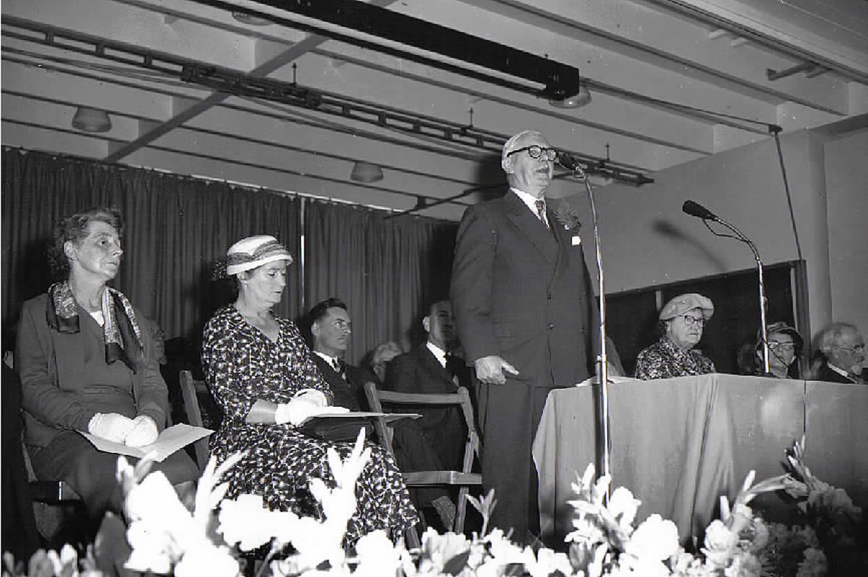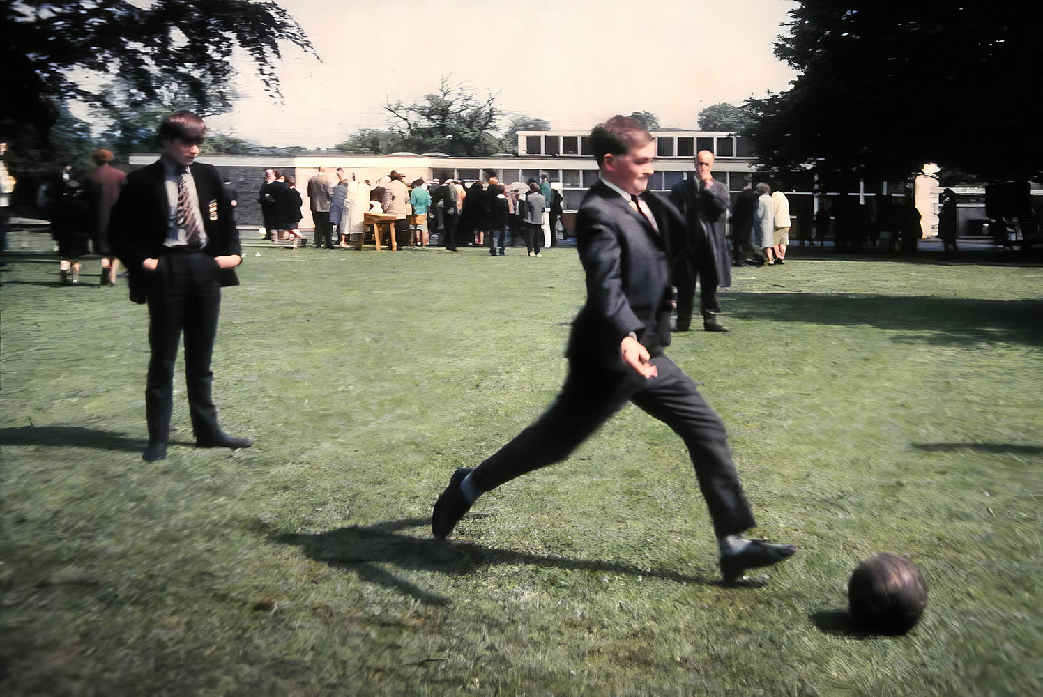 | From Speech Day, 1952: Identifiable prizewinning boys are Ian McCulloch (extreme left), Gilbert (with specs in centre), Robjohns (pointing), Brian Workman and A Jones (hand in pocket), John Scarbrow (holding cup) and Brian Jenkins (in specs and cap at right). The adults are all parents. From Brian Jenkins - June, 2005 |